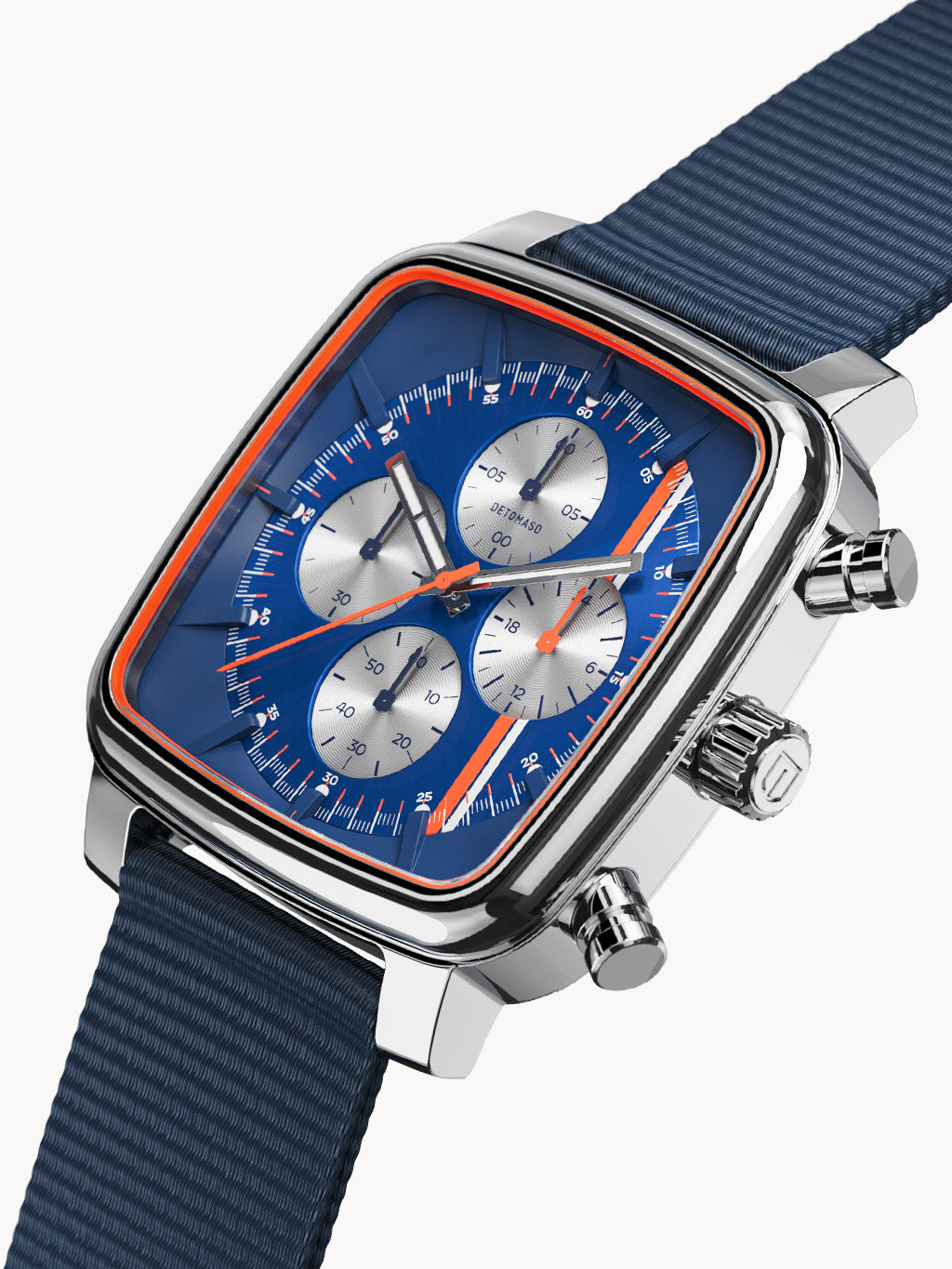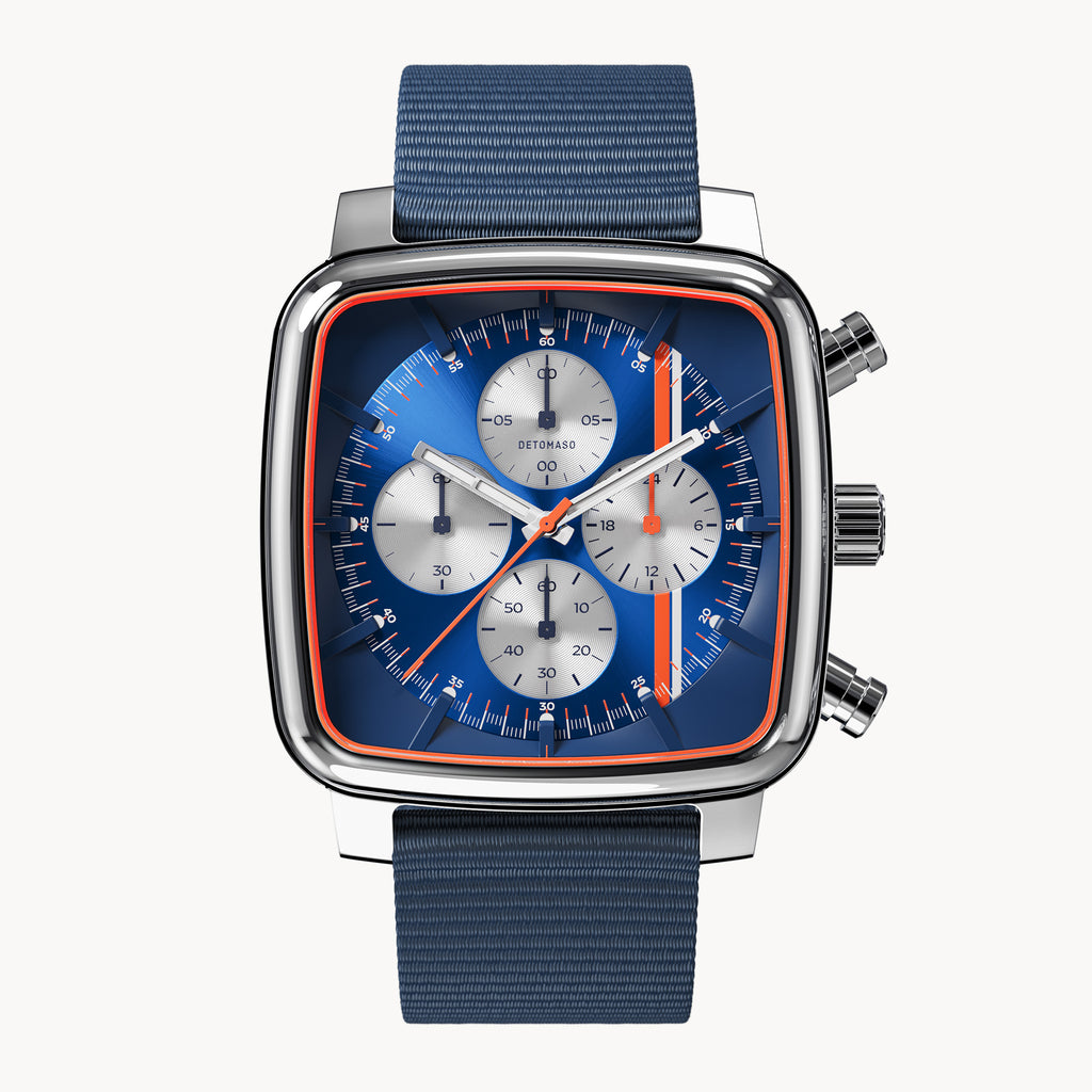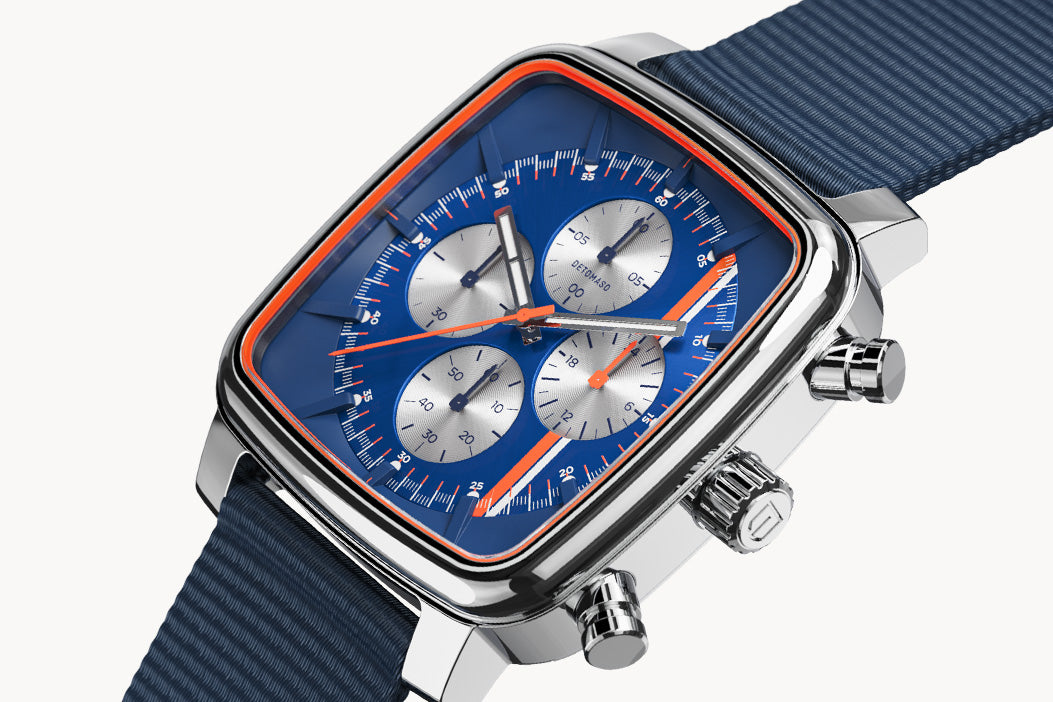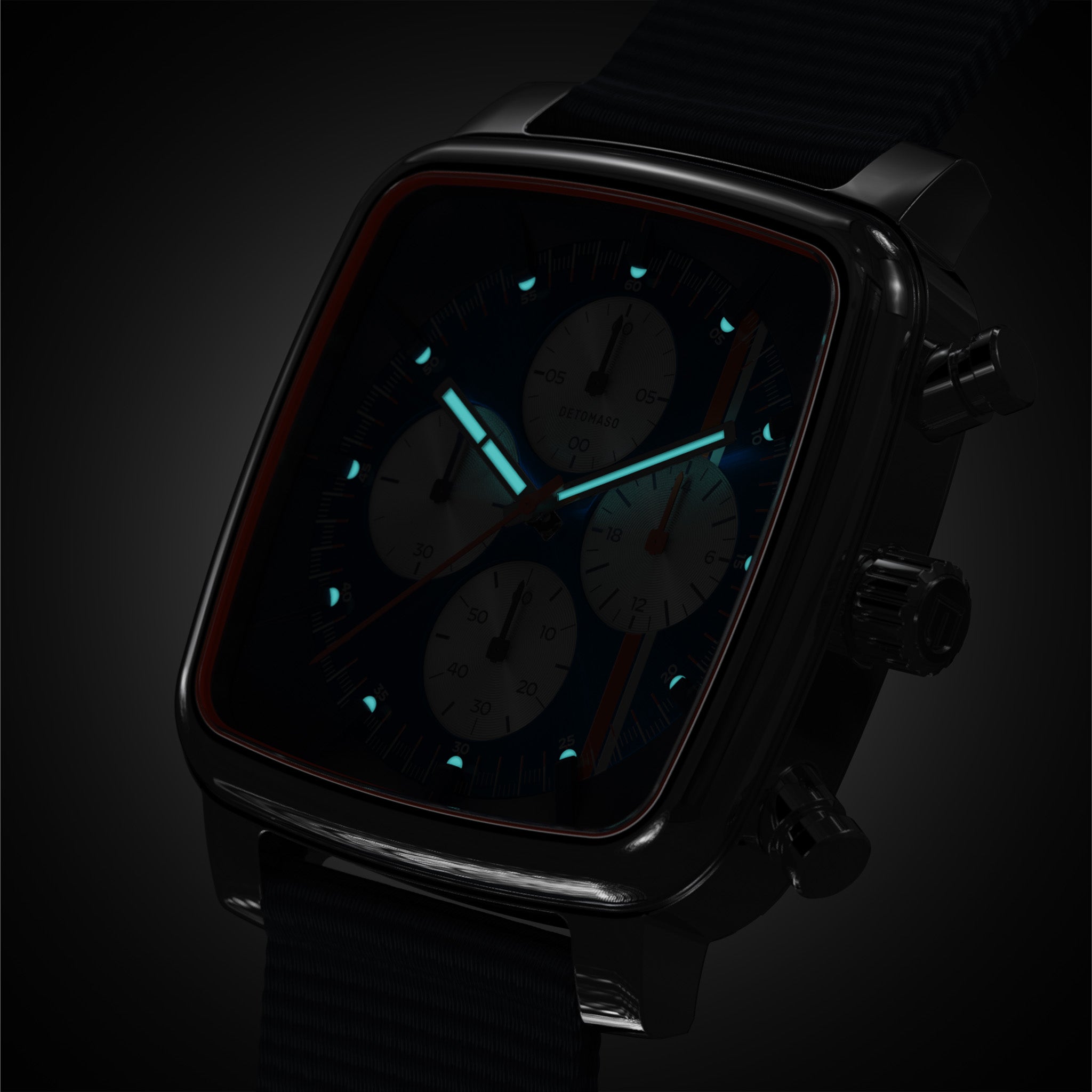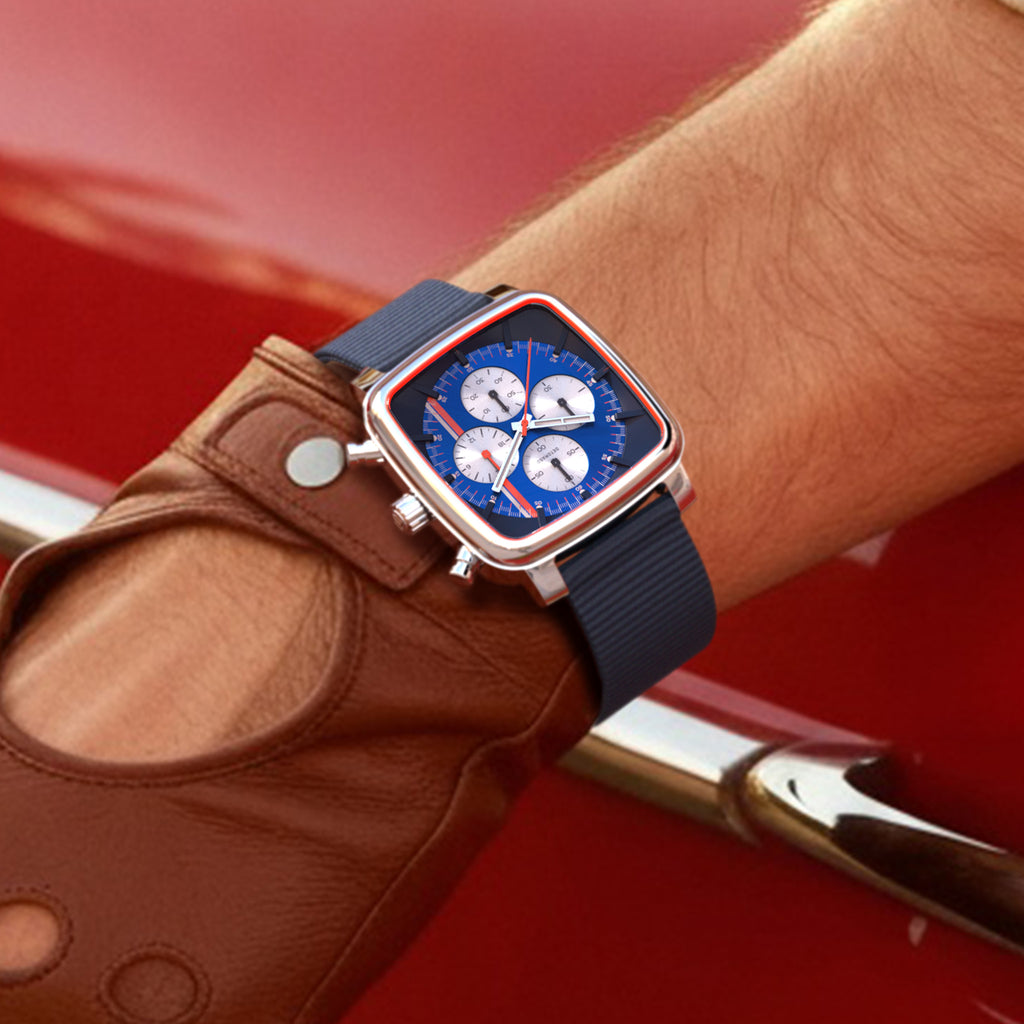 Das viereckige, abgerundete Gehäuse, das Zifferblatt mit den vier zusätzlichen Anzeigen, Superluminova-Elementen und sogar Details wie die Zeigerform sind durchzogen von Vintage-Racing-Charme.