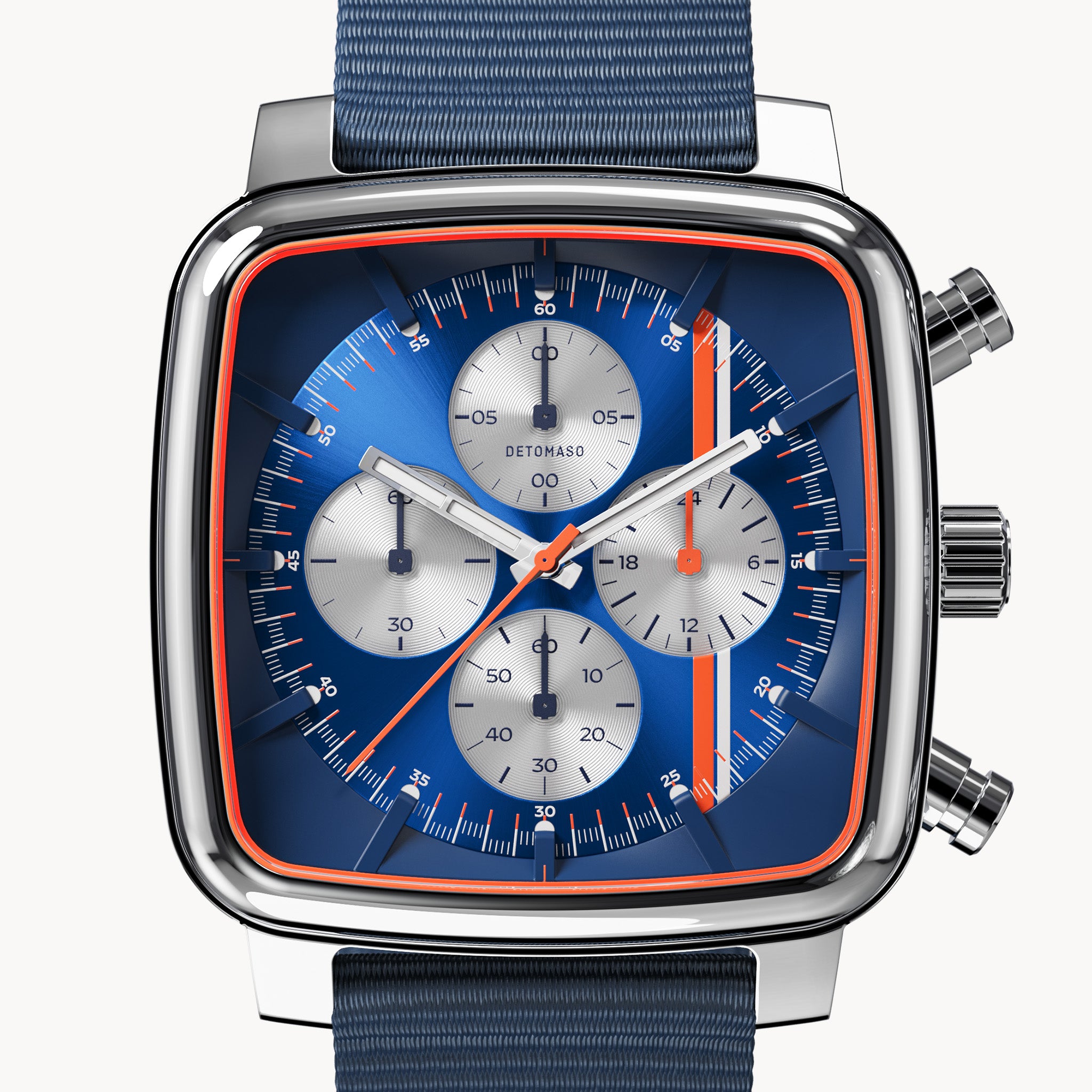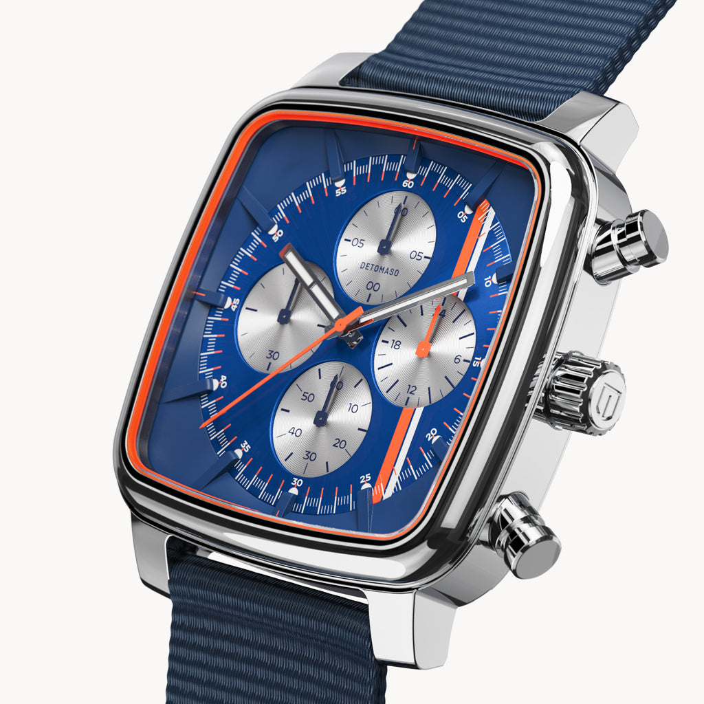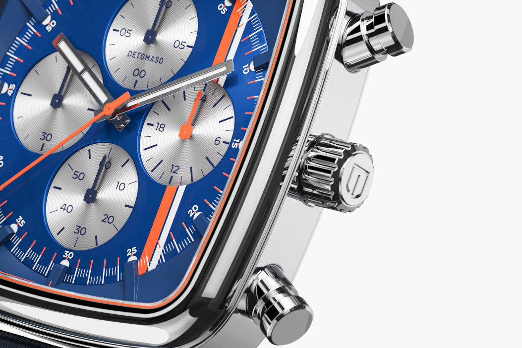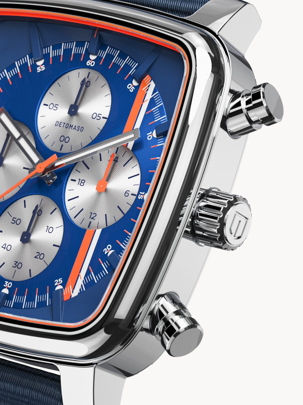 Das viereckige, abgerundete Gehäuse, das Zifferblatt mit den vier zusätzlichen Anzeigen, Superluminova-Elementen und sogar Details wie die Zeigerform sind durchzogen von Vintage-Racing-Charme.
