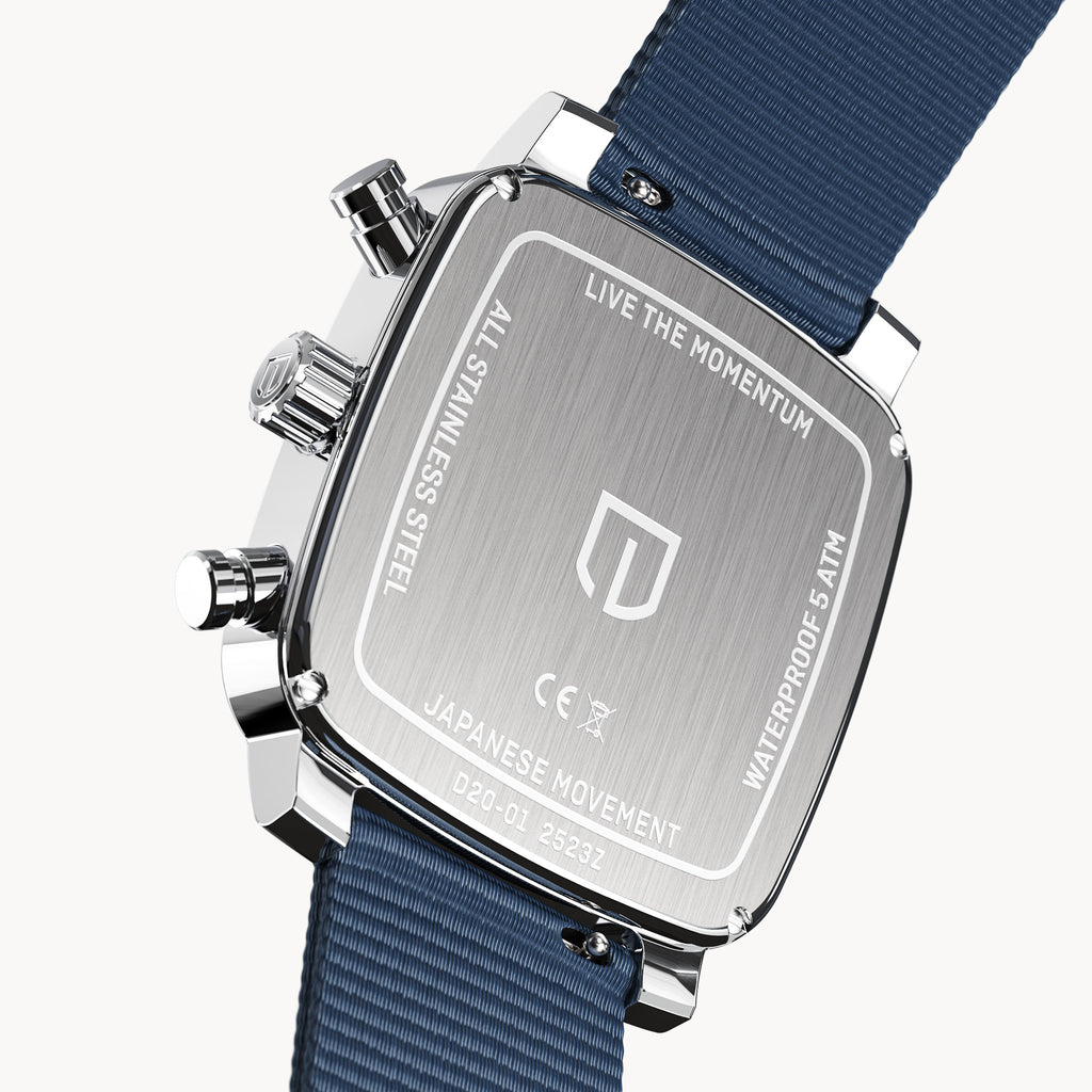 Jede Zehntelsekunde kann entscheidend sein. Darum setzen wir beim D20 CHRONO STRADALE auf das ebenso zuverlässige wie präzise Quarzwerk VD56 von TMI. Mit den beiden Drückern an der Gehäuseseite lässt sich die Zeit stoppen. Der erste Drücker setzt die Chronographen-Anzeige in Bewegung, der zweite stoppt sie wieder. So leicht hast du alles unter Kontrolle.