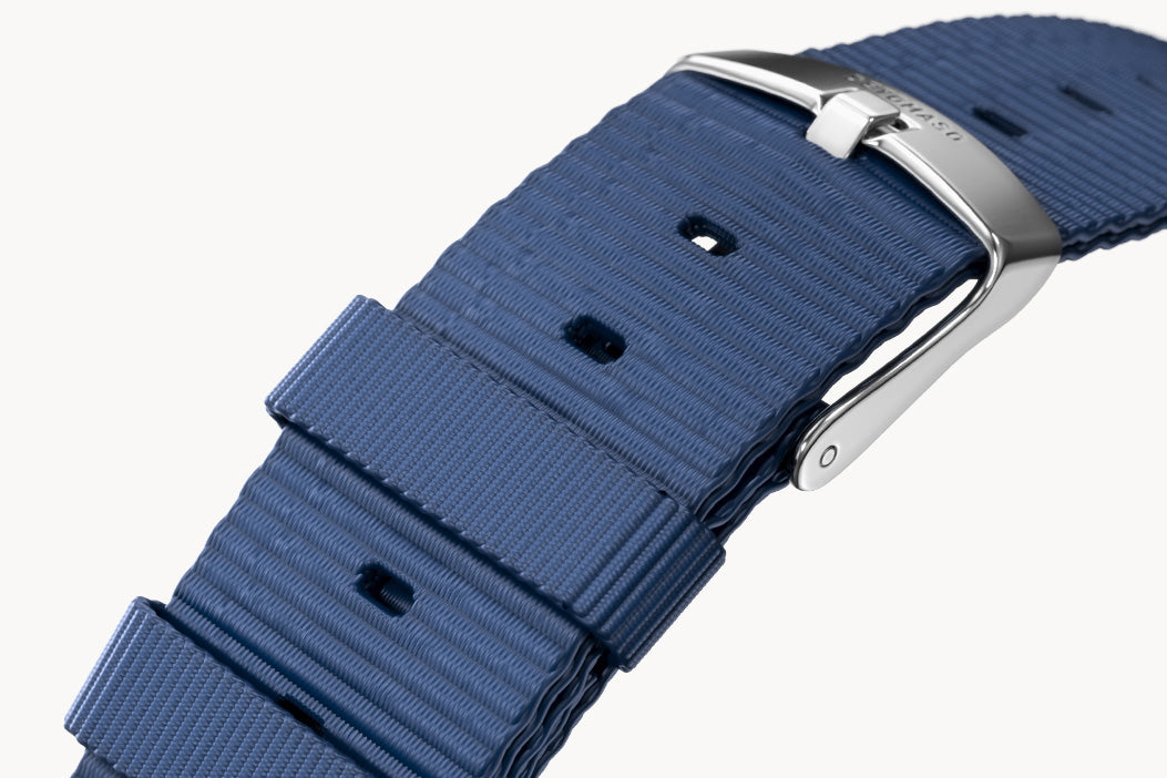 Das Armband besteht einem robusten, aber sehr angenehm zu tragendem Stoff, der aus recyceltem PET gewonnen wird. Zudem ist das Band mit einem Wechselmechanismus ausgestattet. Mit nur einem Handgriff kannst du es gegen ein anderes Band austauschen und der Uhr so einen völlig neuen Look verleihen.