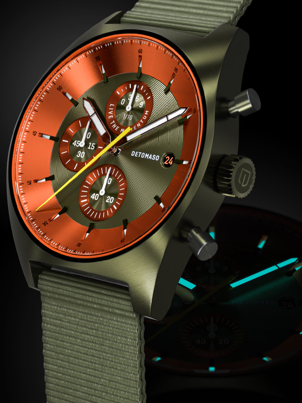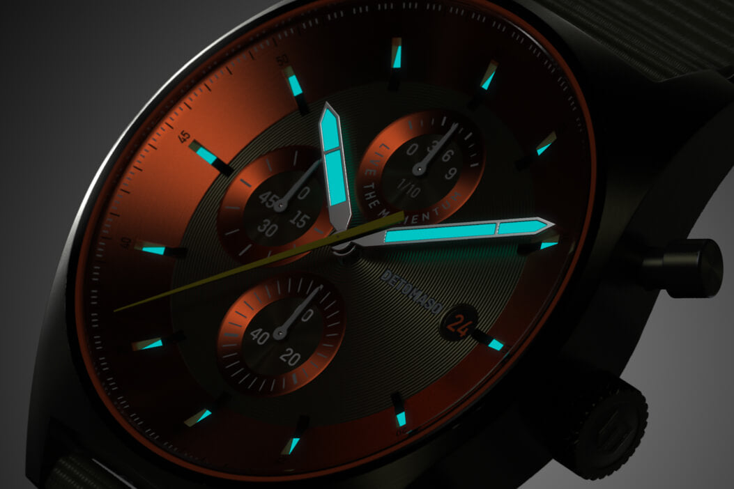 It's when the lights go down that the D10 CHRONOGRAPH really comes to life. Its hour and minute hands are coated with Superluminova. In the dark, this material glows – making it possible to tell the time at a glance, even at night.
