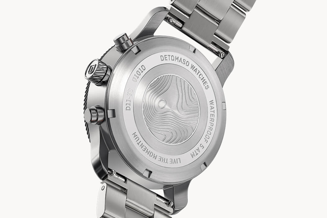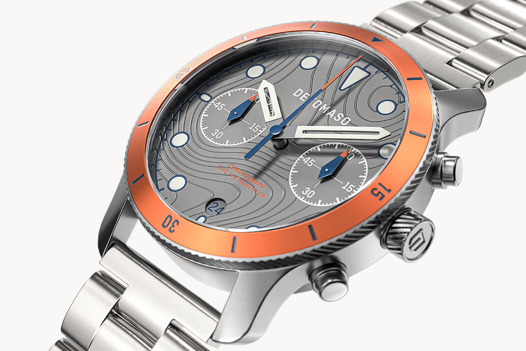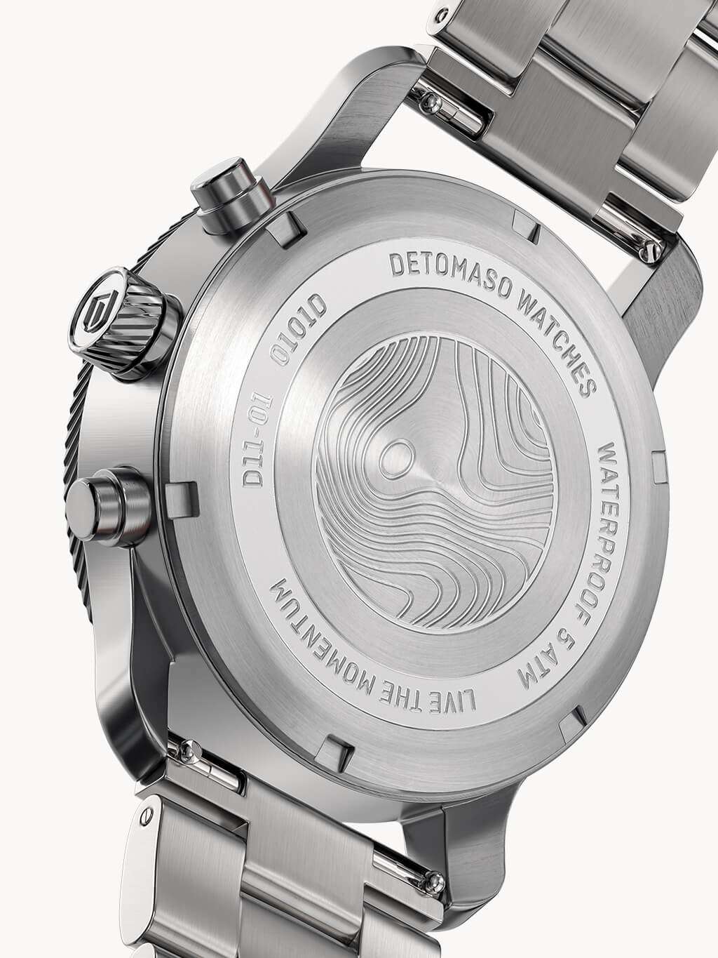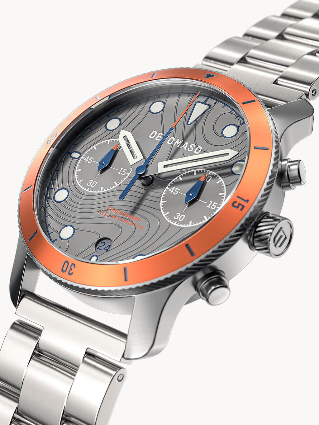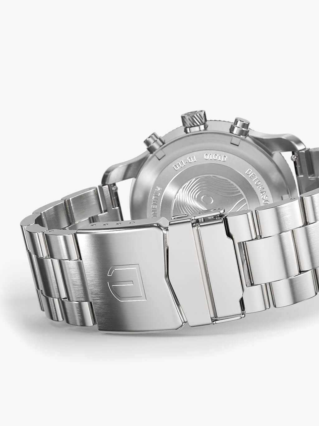 Every outdoor adventure needs a good map: what terrain, rivers, lakes and boundaries await me on my journey? The silk-matte dial of the sporty Chronograph is based on the typical pattern of these maps. Depending on the incidence of light, you can see the embossed, curved lines on the dial more strongly or more gently. This pattern is also featured on the back of the case.