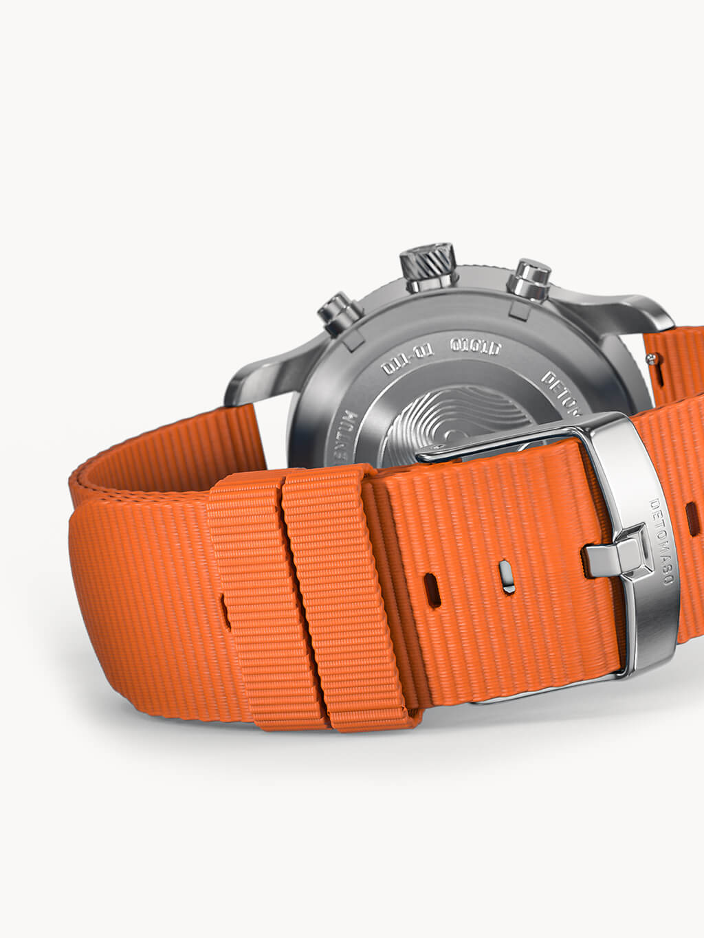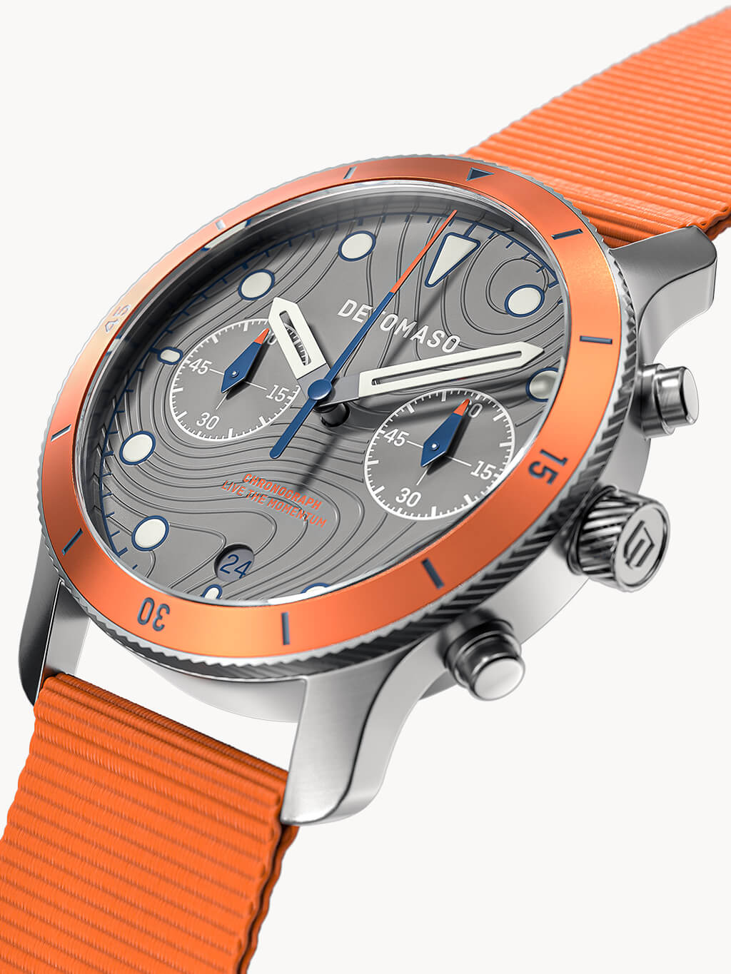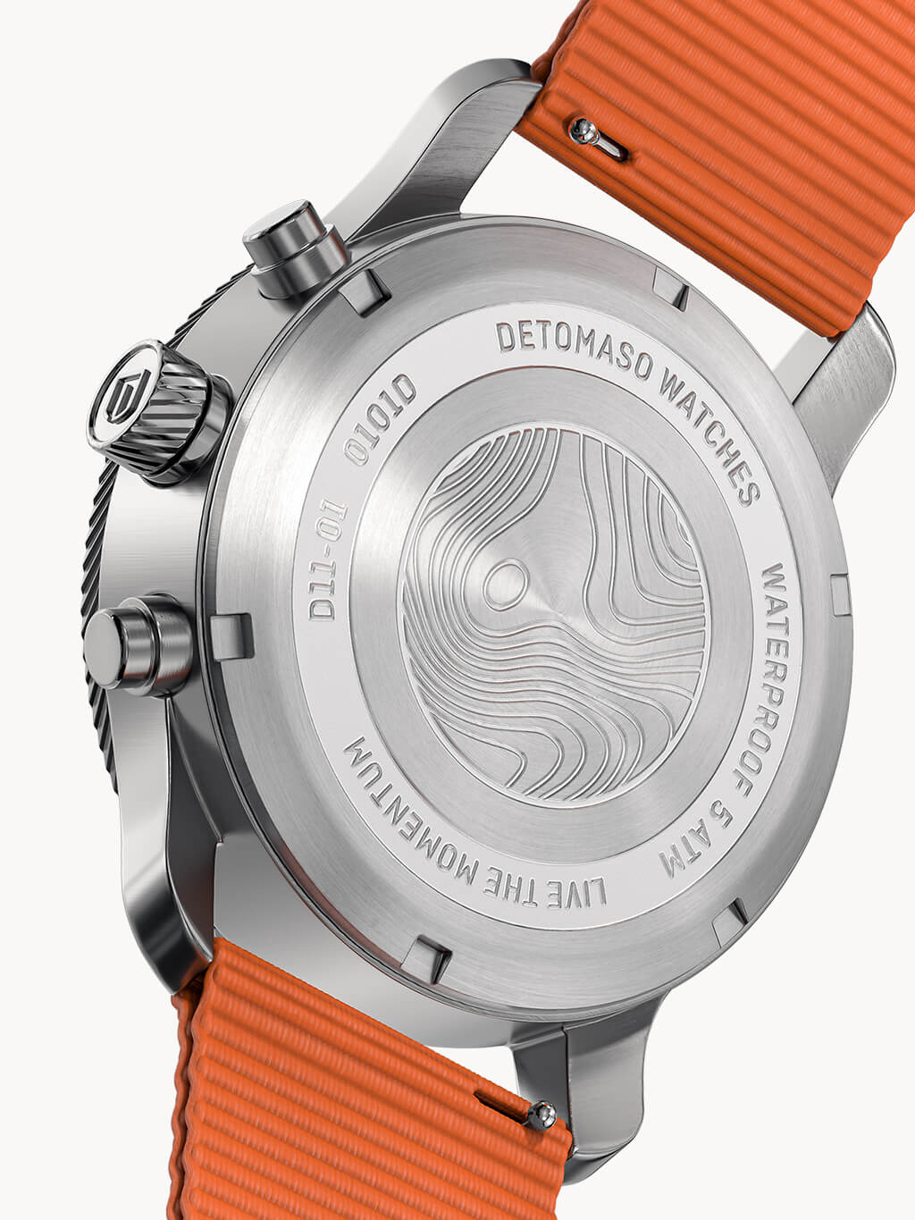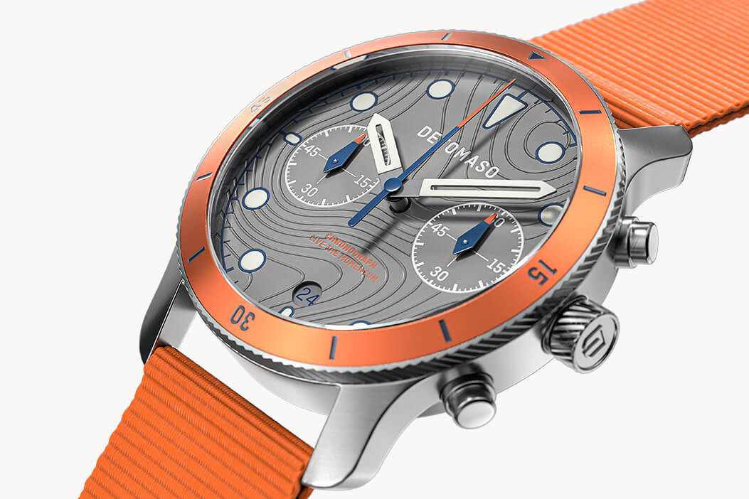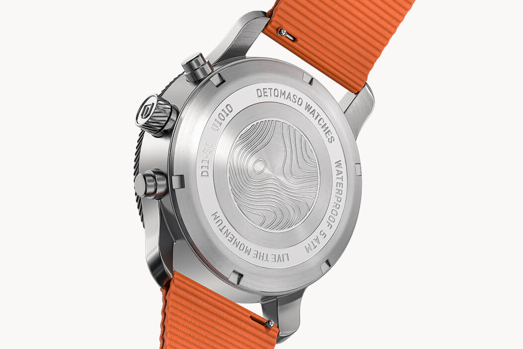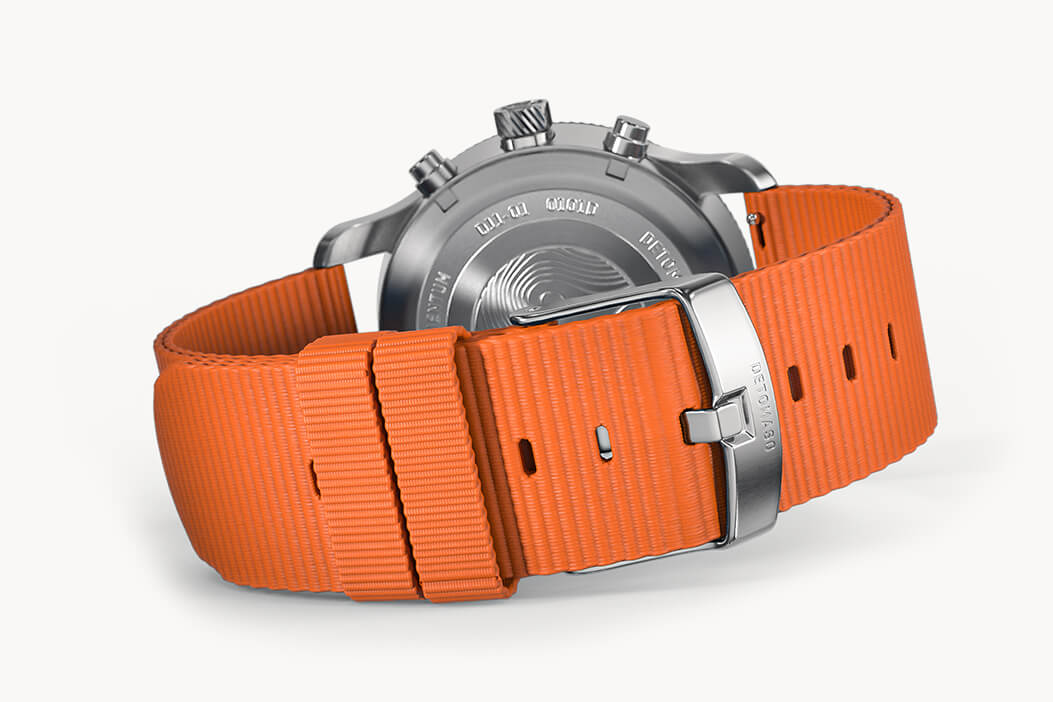 Every outdoor adventure needs a good map: what terrain, rivers, lakes and boundaries await me on my journey? The silk-matte dial of the sporty Chronograph is based on the typical pattern of these maps. Depending on the incidence of light, you can see the embossed, curved lines on the dial more strongly or more gently. This pattern is also featured on the back of the case.