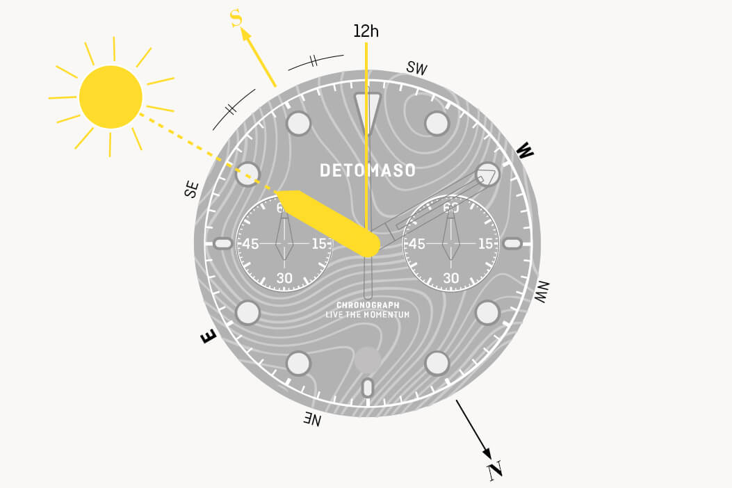 The design of the Chronograph eyes is inspired by compass needles. But did you know that you can actually use your watch to show the compass directions? Just lay it flat. Line up the hour hand with the sun. South is located approximately between the hour hand and the 12 o'clock position. This is how easy it is to use your watch as a compass.