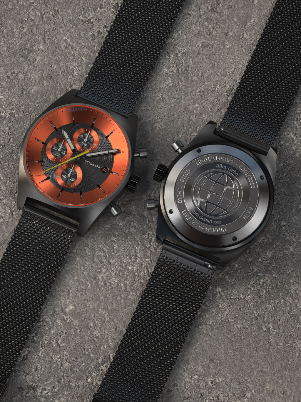Whether you want to give a special person a big treat or you want to treat yourself: for some watches, we offer engravings on the back of the case. Whether it's a special date, the wearer's initials, or a short message, you have room for 34 characters for a little message that means a lot.