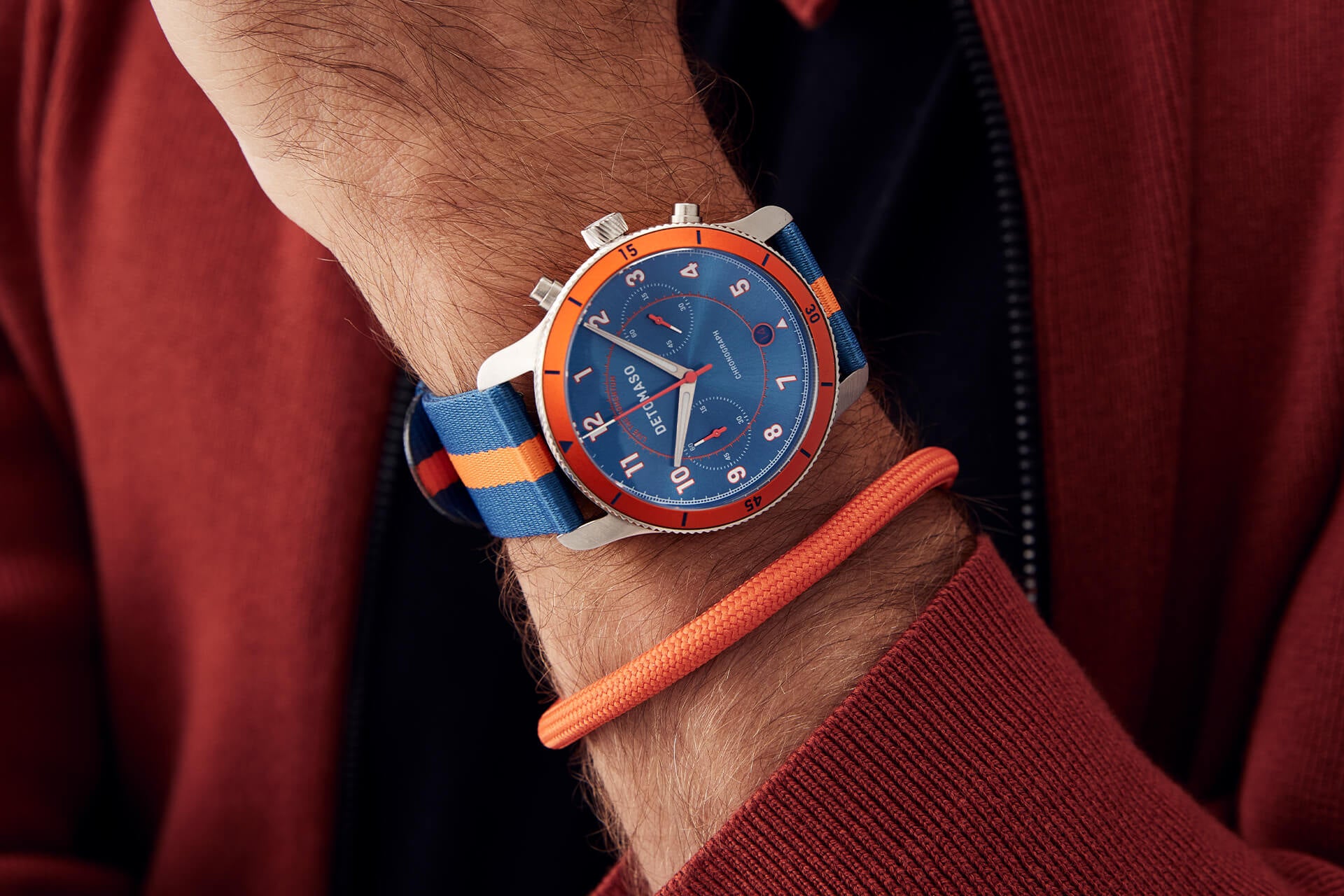 The D10 CHRONOGRAPH is not only inspired by the desire for travel, but rather also by the extraordinary designs from the 70s. Round shapes and striking color accents provide for a stylish retro tribute. This makes the chronograph extremely dynamic in its own way.