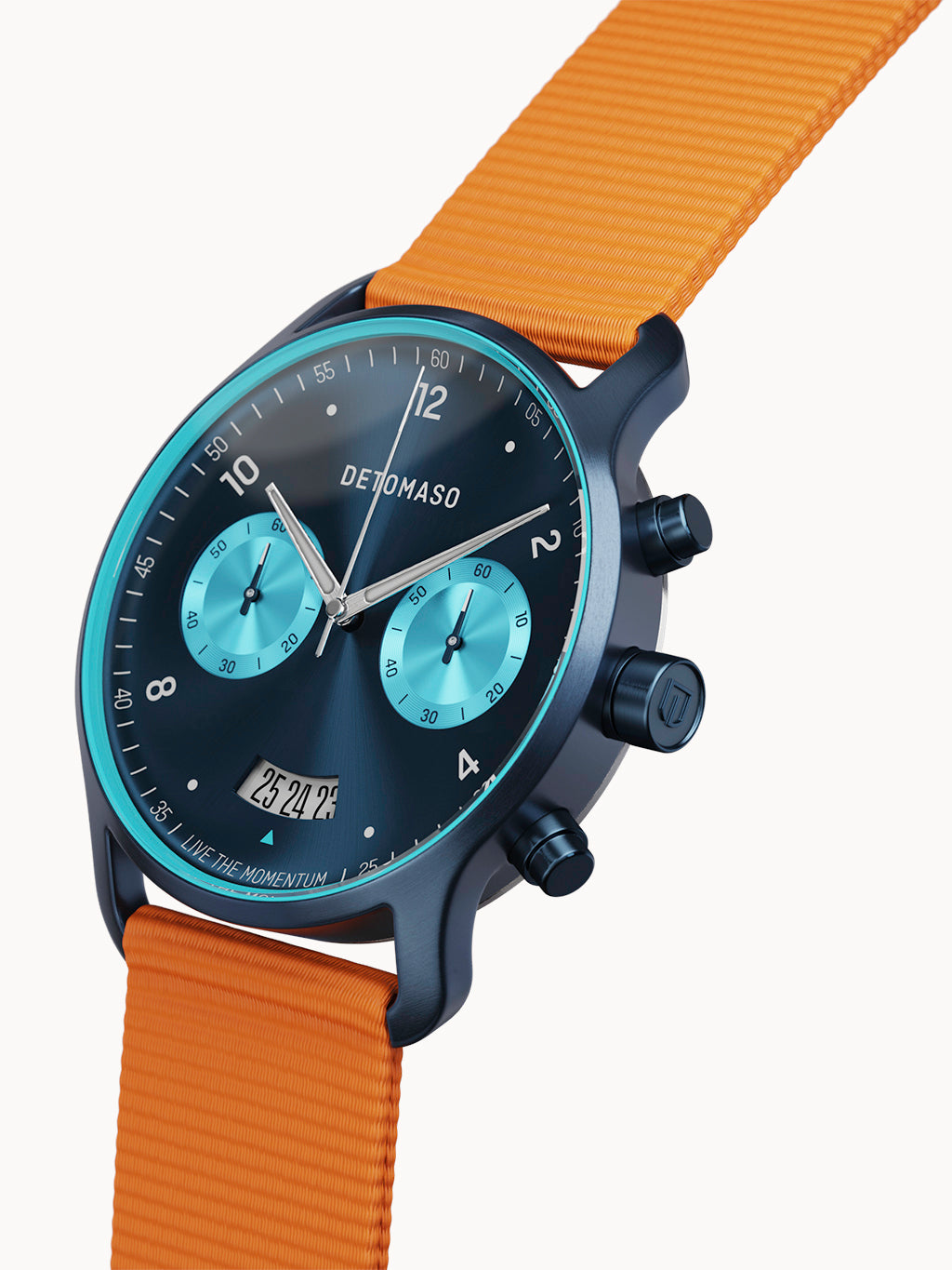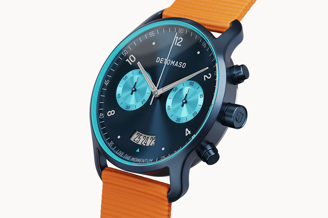El complejo movimiento del fabricante tradicional Miyota cuenta con una función de cronógrafo. Dos pulsadores en el lateral de la caja son todo lo que necesitas para operarlo: un primer pulsador pone en marcha los indicadores del cronógrafo, un segundo pulsador los detiene. Para no perder de vista el tiempo, el SORPASSO CHRONOGRAPH también mantiene todo el día a la vista con su función de fecha.