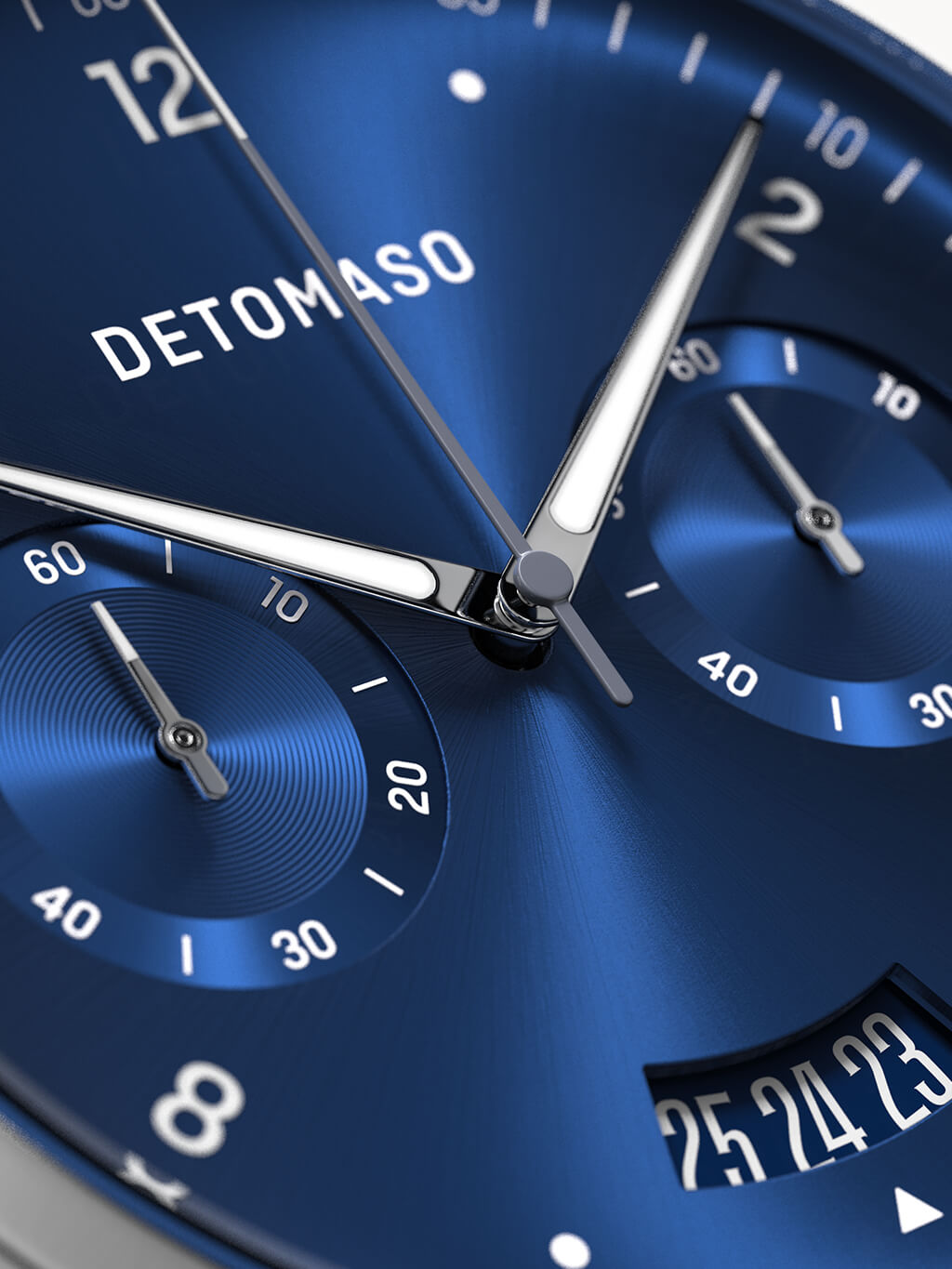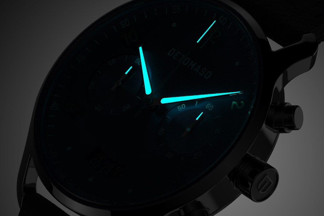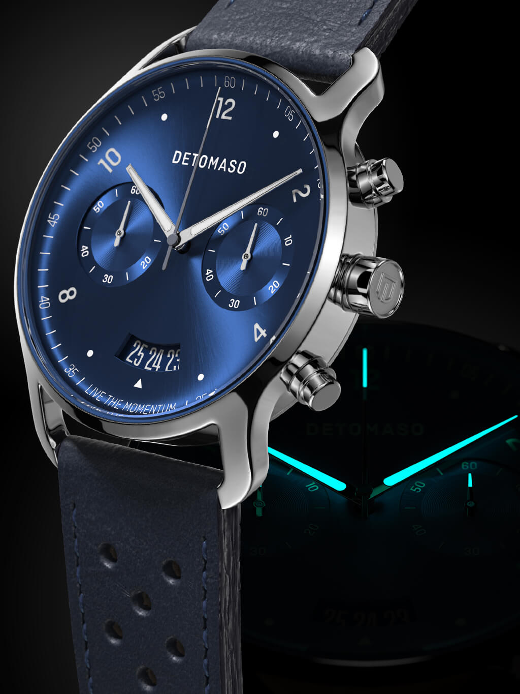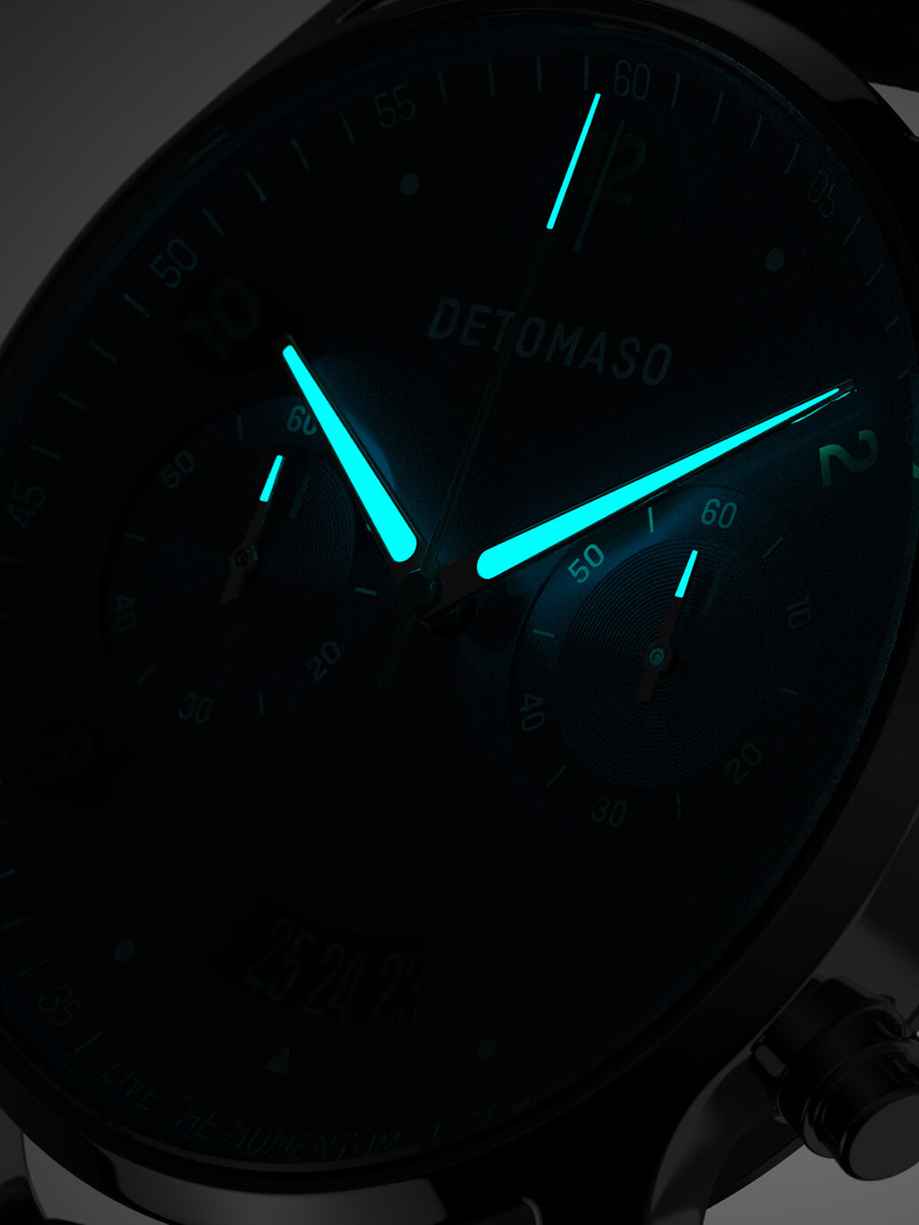 Incluso de noche, el SORPASSO CHRONOGRAPH es un verdadero punto de atracción. Gracias al minutero y al segundero resplandecientes, este reloj brilla por todo lo alto junto con las estrellas. También lo hacen sus dígitos grandes. De esta forma, podrás consultar y medir el tiempo en cualquier momento del día. Para momentos brillantes.