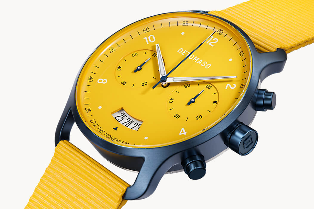 Piel de gallina, sudor y felicidad: el deporte de motor fascina a pilotos y fanáticos desde hace años. Ya sea para triunfos gloriosos o para una carrera intensa entre dos pilotos, la diversión está asegurada. Para ello, el amarillo alegre del SORPASSO CHRONOGRAPH aporta un toque radiante que hará brillar al usuario.