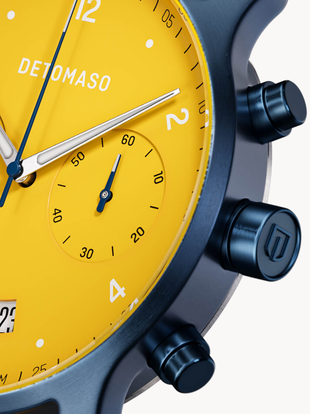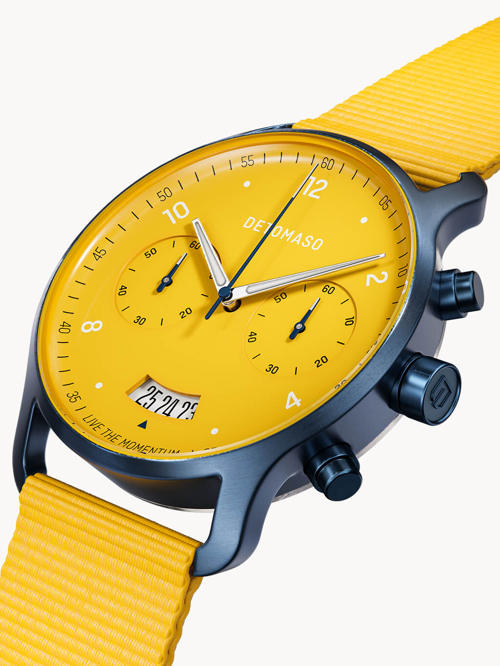 ...se dirige a la pista de carreras y va todo recto hasta la línea de meta. ¿Adrenalina para la muñeca? El diseño automovilístico del cronógrafo ahora lo hace posible. El amarillo chillón en combinación con los elementos destacados en azul oscuro abducen al observador al mundo del automovilismo. Sus elementos destacados veloces y sus formas dinámicas completan el aspecto y permiten al CRONÓGRAFO SORPASSO pasar como un bólido por la recta final.