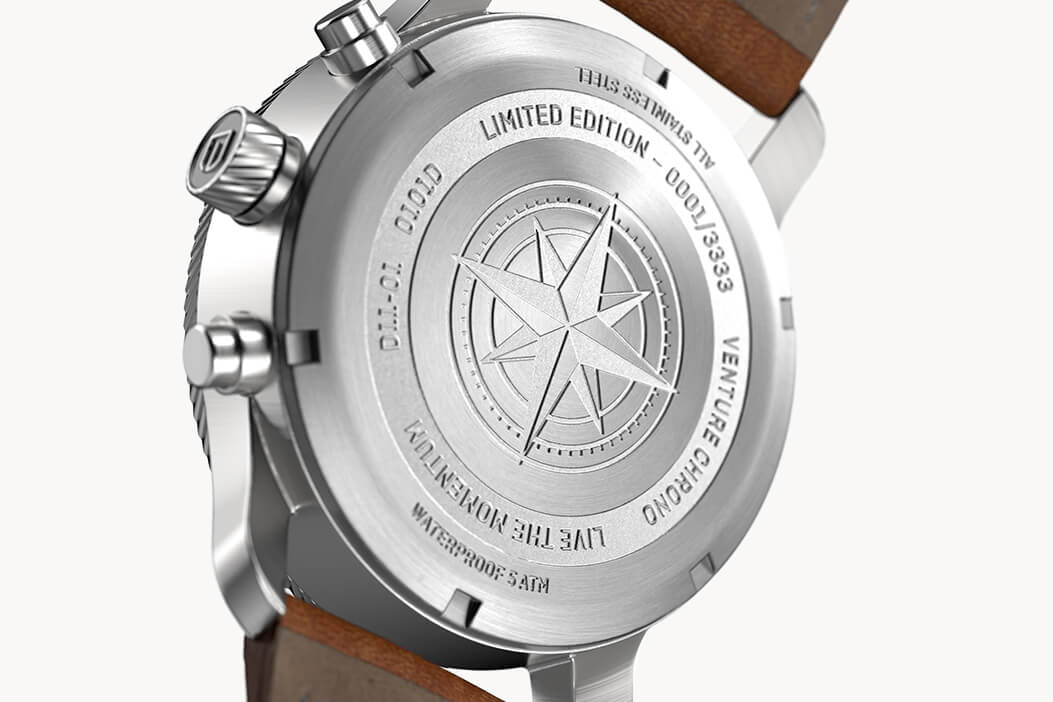 Tanto si se conquista la cima o se domina la ola: la adrenalina provoca una satisfacción y orgullo máximos. Inspiriado en esta sensación única, el VENTURE CHRONOGRAPH de edición limitada es el acompañante ideal de todo aquel al que le gusta superarse a sí mismo. Y al igual que esta sensación: solo hay disponibles 3333 unidades de cada versión de color. En el dorso hay además el número de serie individual del reloj. Aquel que sea rápido podrá hacerse con una auténtica pieza única.