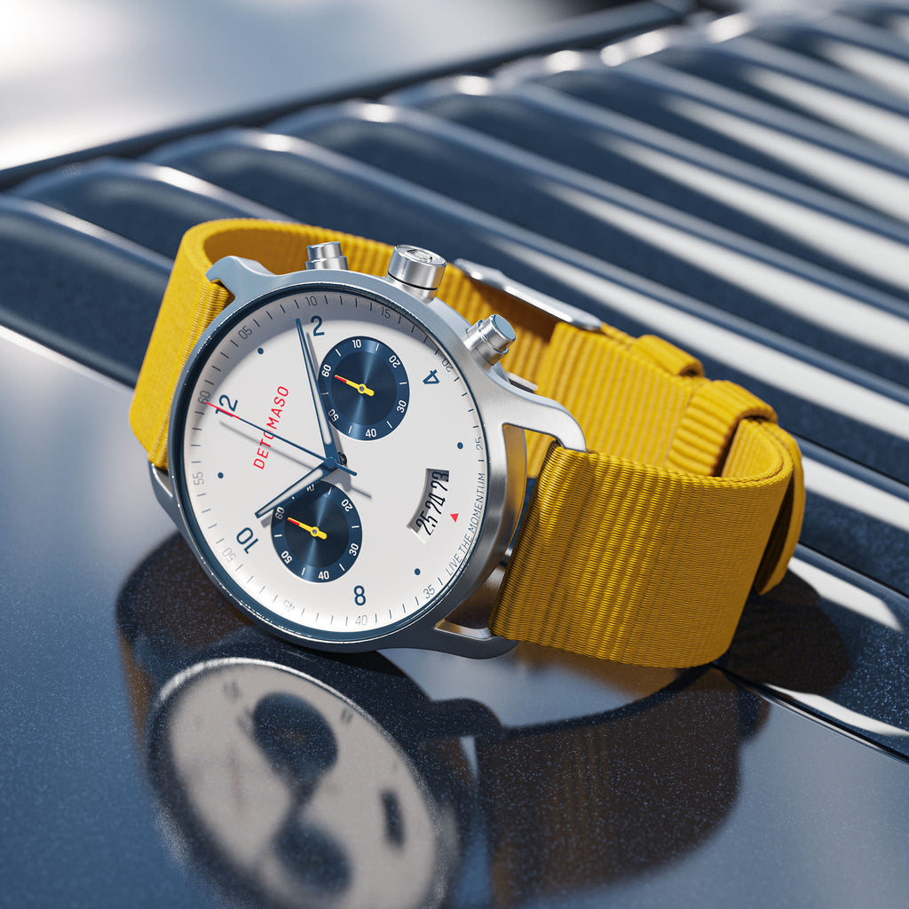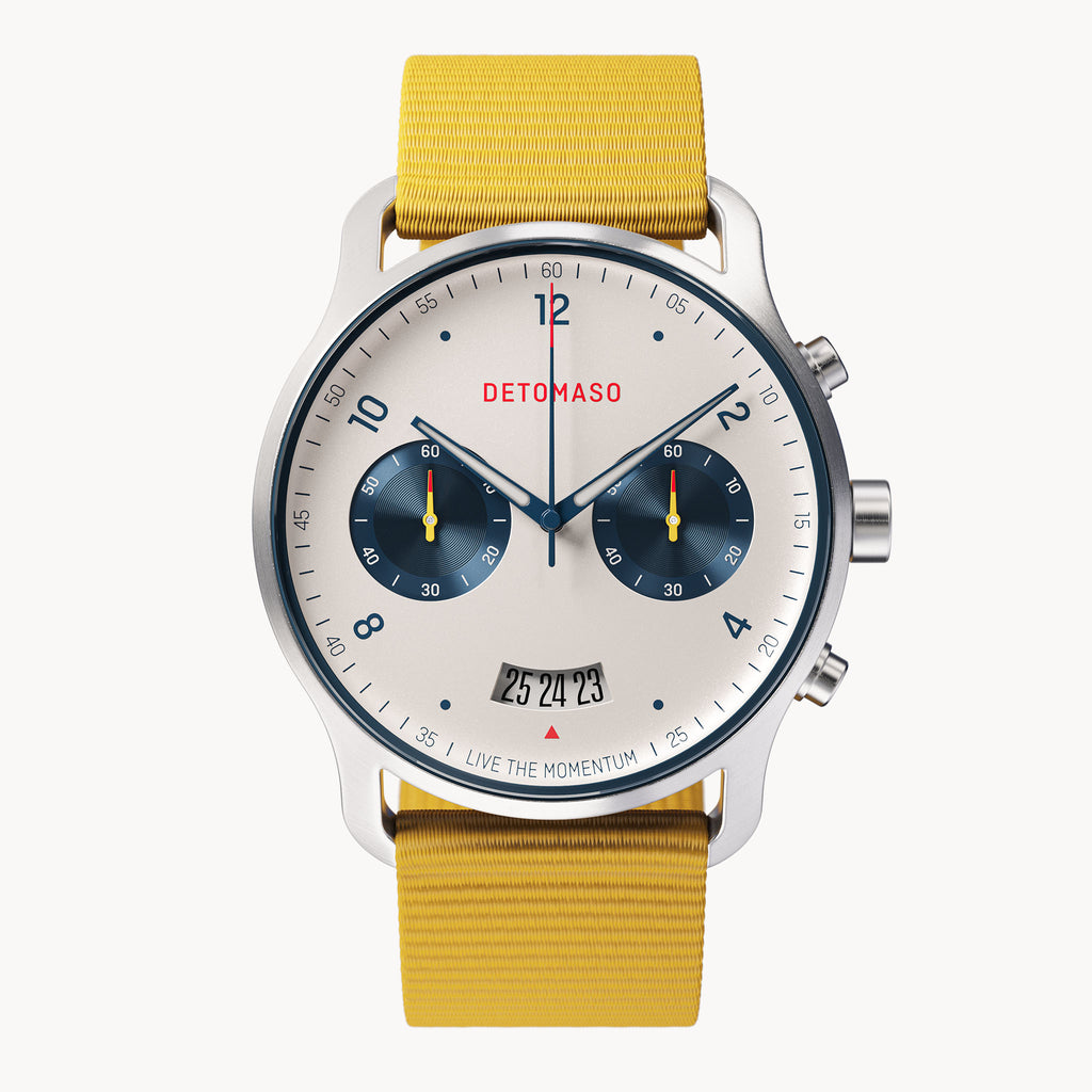 C'est un road trip à travers l'Italie qui a inspiré les montres DETOMASO. La monture qui l'a fidèlement accompagné était une voiture de sport des années 1970. Les véhicules de cette époque sont devenus légendaires car ils alliaient comme aucun autre allure sportive et élégance. Une fusion que nous exigeons également des montres DETOMASO. Ainsi, en même temps qu'il témoigne de notre niveau de qualité, chaque modèle incarne les fondements de notre réussite : laisser le quotidien derrière soi pour vivre sa propre liberté – en bref, « LIVE THE MOMENTUM ».