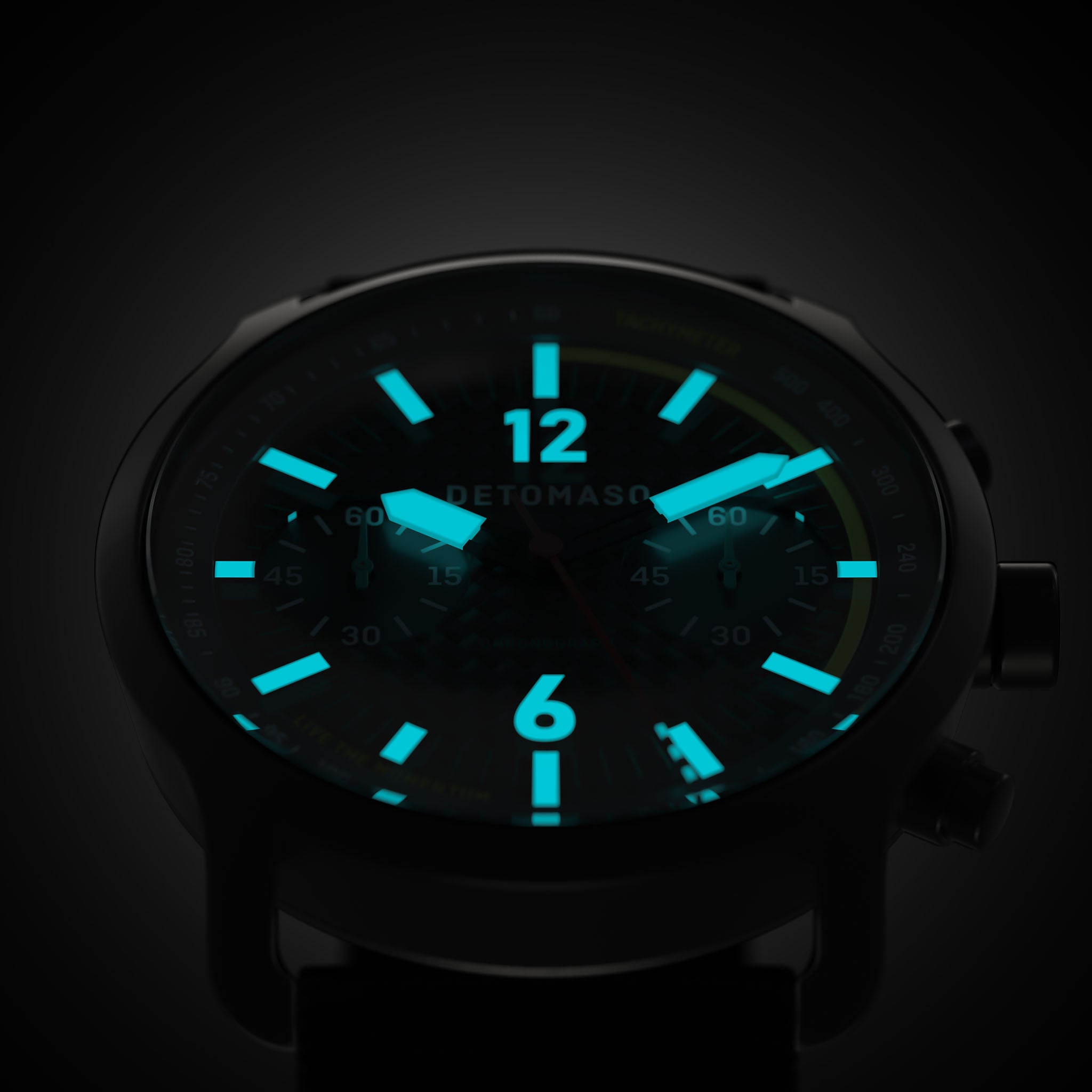 Atteignez vos objectifs à grande vitesse en mesurant votre temps à l'aide des poussoirs latéraux du boîtier. Le premier lance le chronographe, le second l'arrête. Et pour couronner le tout, vous pouvez même compter sur votre SORPASSO CHRONOGRAPH CARBON la nuit, grâce au Superluminova appliqué sur les aiguilles et les index.