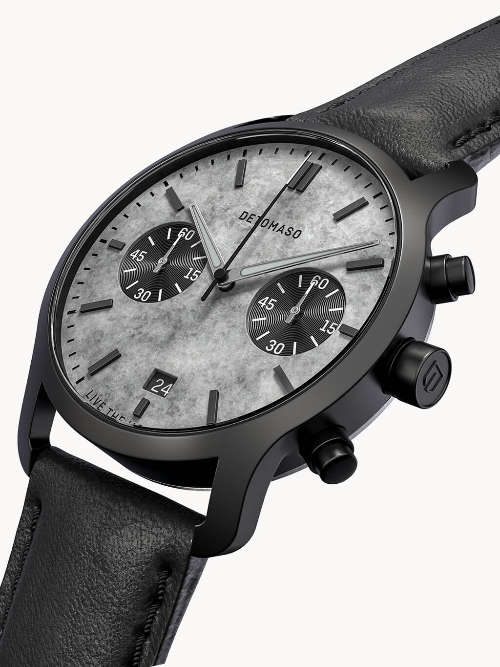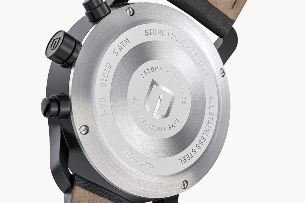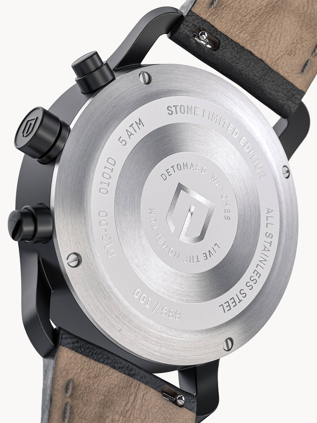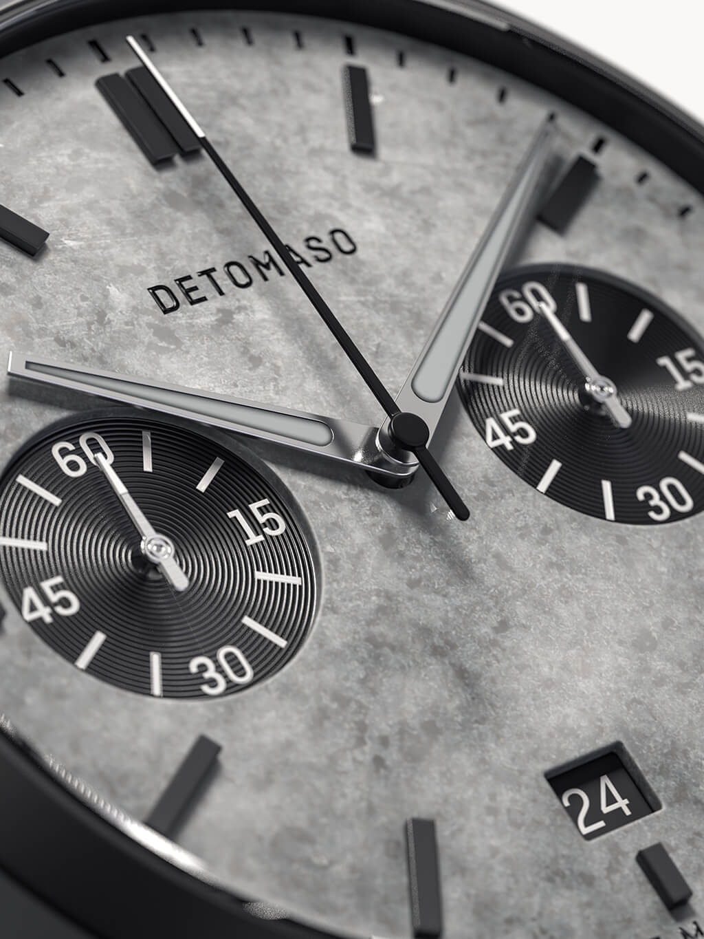 Authentique et non taillé - voilà ce qui définit la SORPASSO CHRONOGRAPH. Le cadran provient d'une pierre naturelle qui rappelle les rochers rugueux et les impressionnants paysages de montagne. Chaque pierre étant unique, chaque SORPASSO CHRONOGRAPH est également une pièce unique. Les totalisateurs gris foncé du chronographe ainsi que le boîtier mat en acier chirurgical 316L s'accordent parfaitement avec le style brut de cette montre en édition limitée.