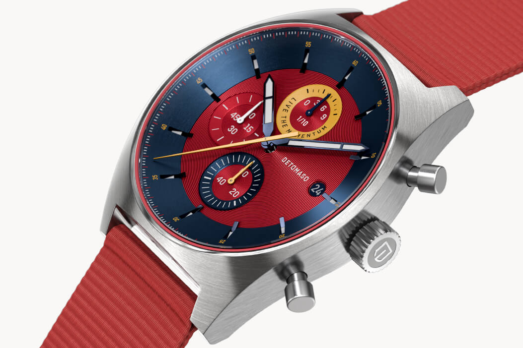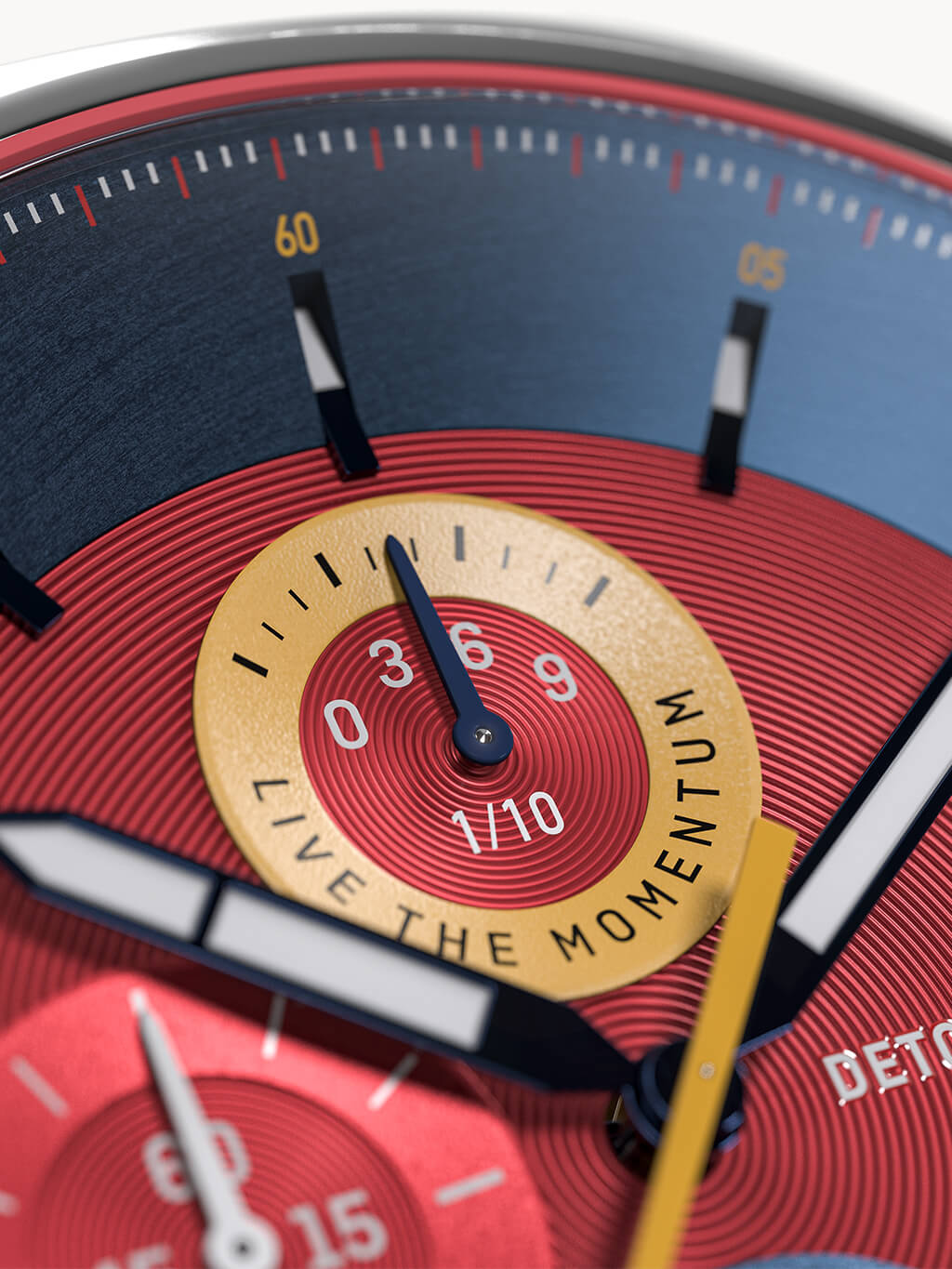 Nel quadrante superiore del cronografo, puoi leggere i decimi di secondo. Qui, il tempo scorre un po' diversamente: l'indicatore retrogrado si muove da sinistra a destra e viceversa, come i tergicristalli di un'auto quando durante un road trip arriva una leggera pioggia estiva.