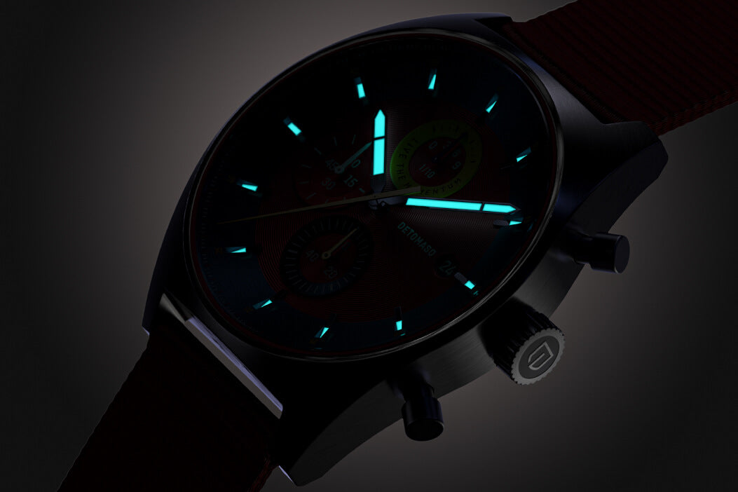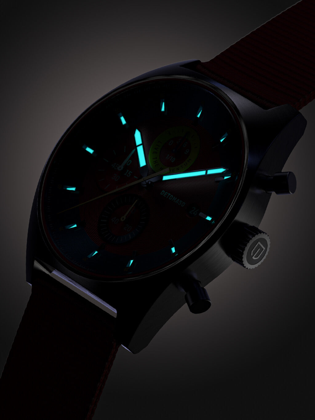 Un punto forte del D10 CHRONOGRAPH diventa davvero visibile al buio. Le lancette delle ore e dei minuti sono rivestite di Superluminova. Al buio, questi elementi iniziano a brillare – permettendoti di leggere l'ora a colpo d'occhio, anche di notte.