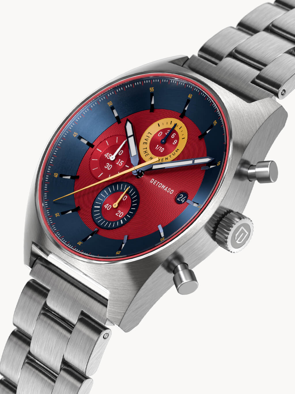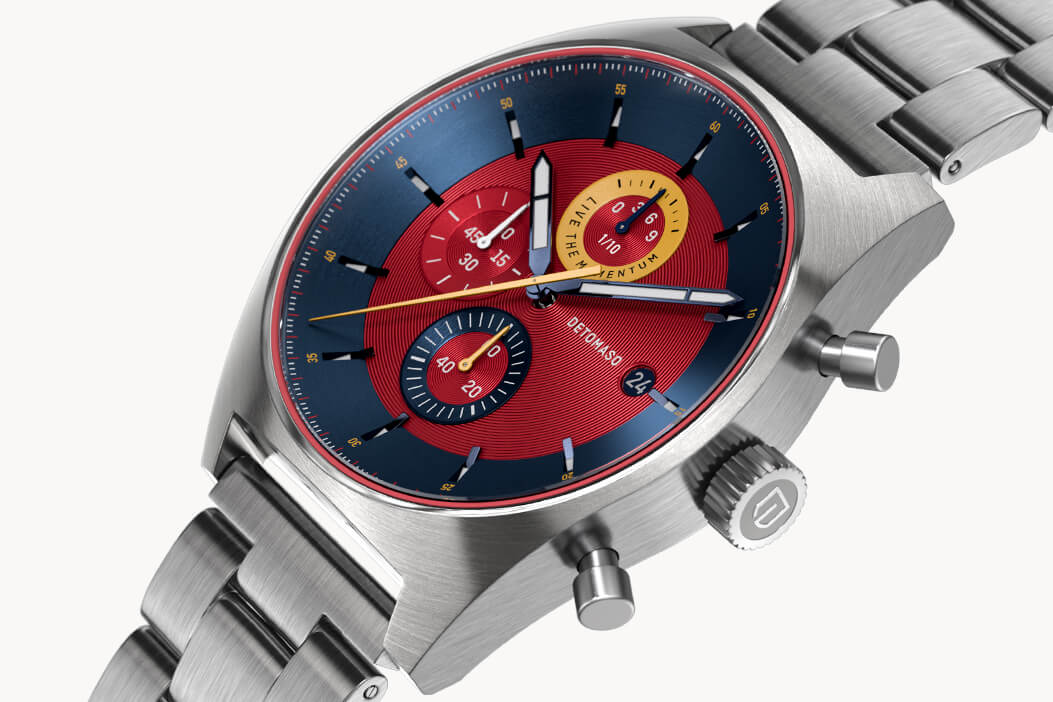 Nel quadrante superiore del cronografo, puoi leggere i decimi di secondo. Qui, il tempo scorre un po' diversamente: l'indicatore retrogrado si muove da sinistra a destra e viceversa, come i tergicristalli di un'auto quando durante un road trip arriva una leggera pioggia estiva.