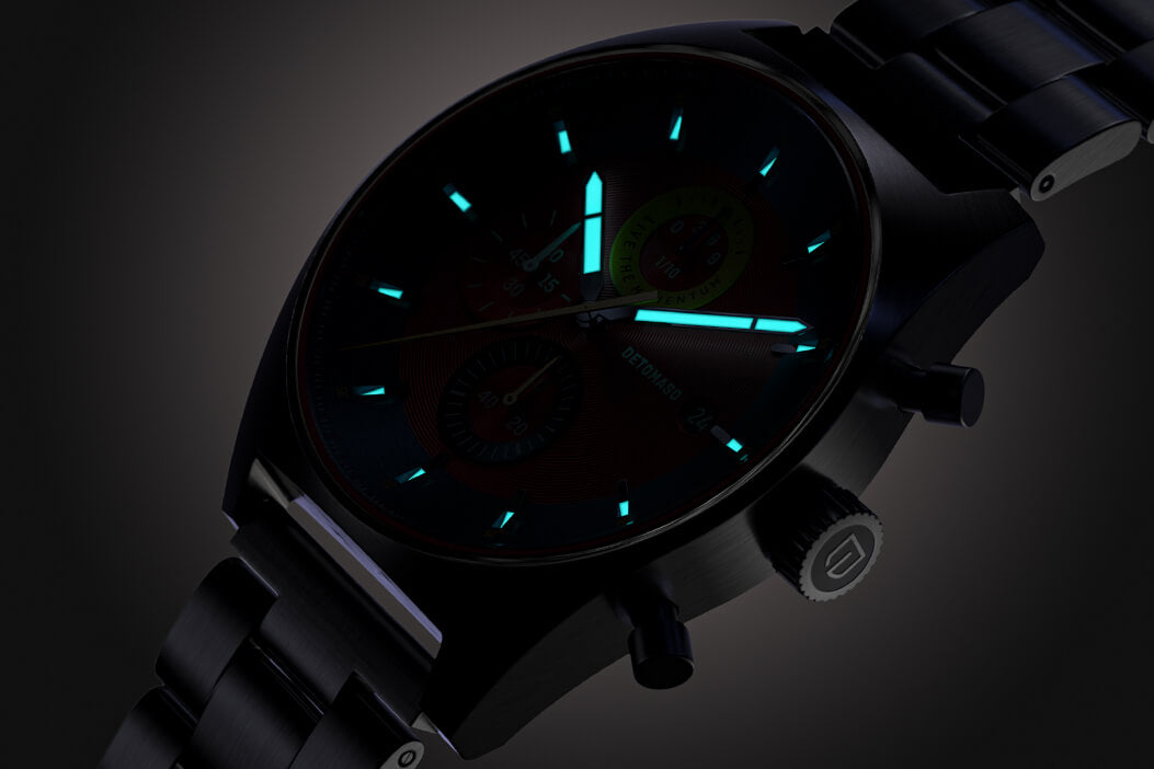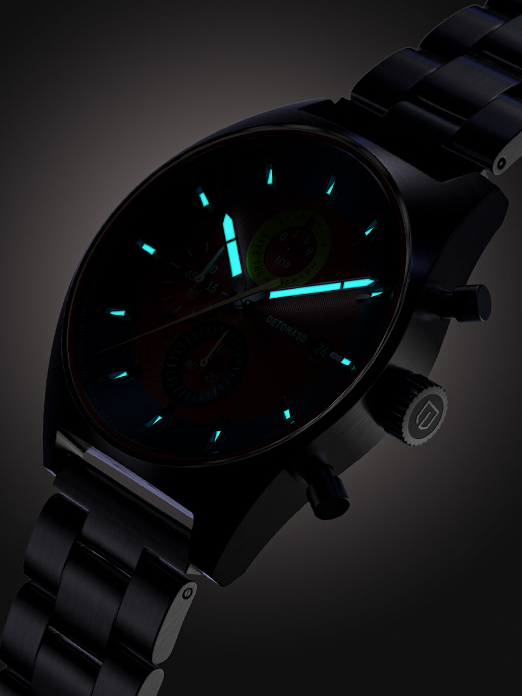 Un punto forte del D10 CHRONOGRAPH diventa davvero visibile al buio. Le lancette delle ore e dei minuti sono rivestite di Superluminova. Al buio, questi elementi iniziano a brillare – permettendoti di leggere l'ora a colpo d'occhio, anche di notte.