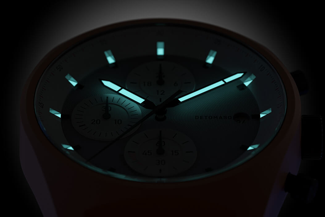Un'ulteriore caratteristica è visibile solo al buio: le lancette delle ore e dei minuti e gli indici sono rivestiti con Superluminova. Ciò permette di leggere l'ora facilmente anche di notte.