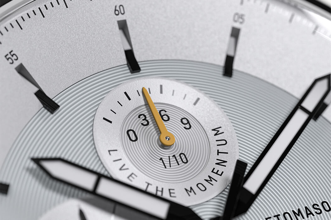Nel quadrante superiore del cronografo, puoi leggere i decimi di secondo. Qui, il tempo scorre un po' diversamente: l'indicatore retrogrado si muove da sinistra a destra e viceversa, come i tergicristalli di un'auto quando durante un road trip arriva una leggera pioggia estiva.