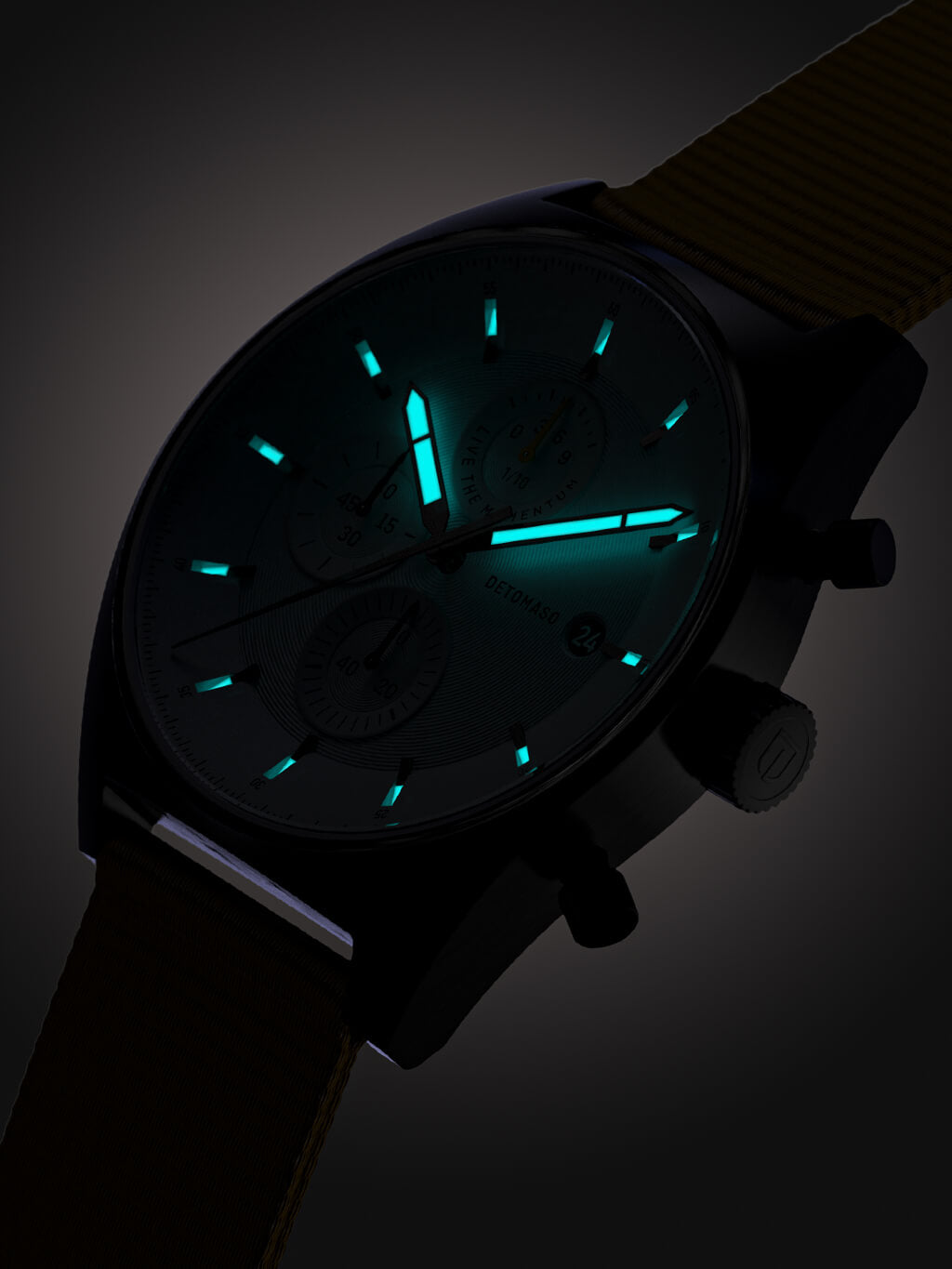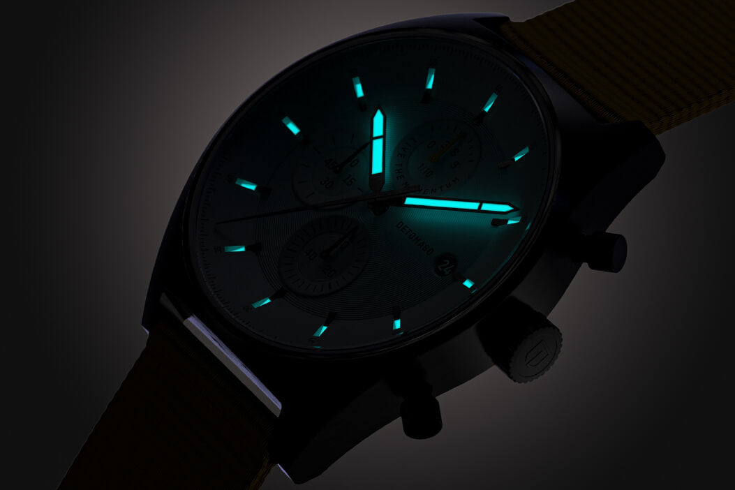 Un punto forte del D10 CHRONOGRAPH diventa davvero visibile al buio. Le lancette delle ore e dei minuti sono rivestite di Superluminova. Al buio, questi elementi iniziano a brillare – permettendoti di leggere l'ora a colpo d'occhio, anche di notte.