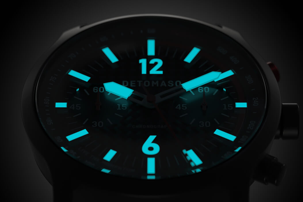 Raggiungi i tuoi obiettivi ad alta velocità: misura il tempo con i pulsanti sul lato della cassa. Con la prima pressione si aziona il cronografo, mentre con la seconda lo si ferma. Ma c'è di più: potrai affidarti al tuo SORPASSO CHRONOGRAPH CARBON anche di notte grazie a Superluminova su lancette e indici.