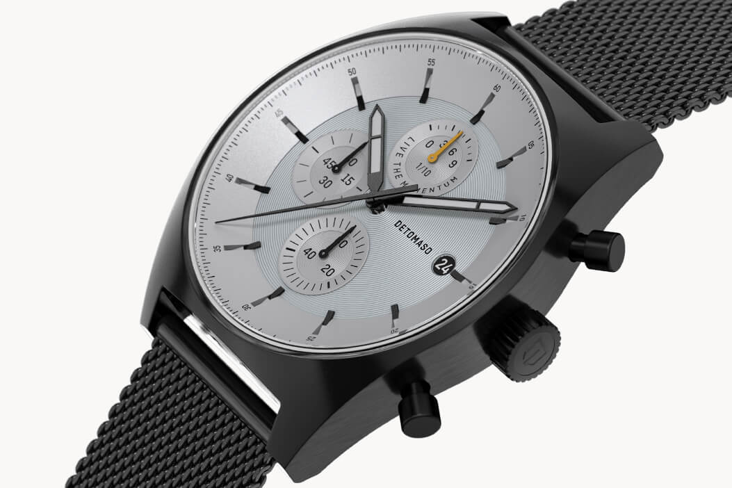 Daj sie poniesc uczuciu wolnosci: D10 CHRONOGRAPH, ze swoim dynamicznym designem, ucielesnia ekscytacje tuz przed rozpoczeciem podrózy. Gdy pózniej na miejscu slonce zachodzi, chronograf swieci dalej nawet noca – dzieki Superluminova na wskazówkach godzinowej i minutowej oraz na indeksach.