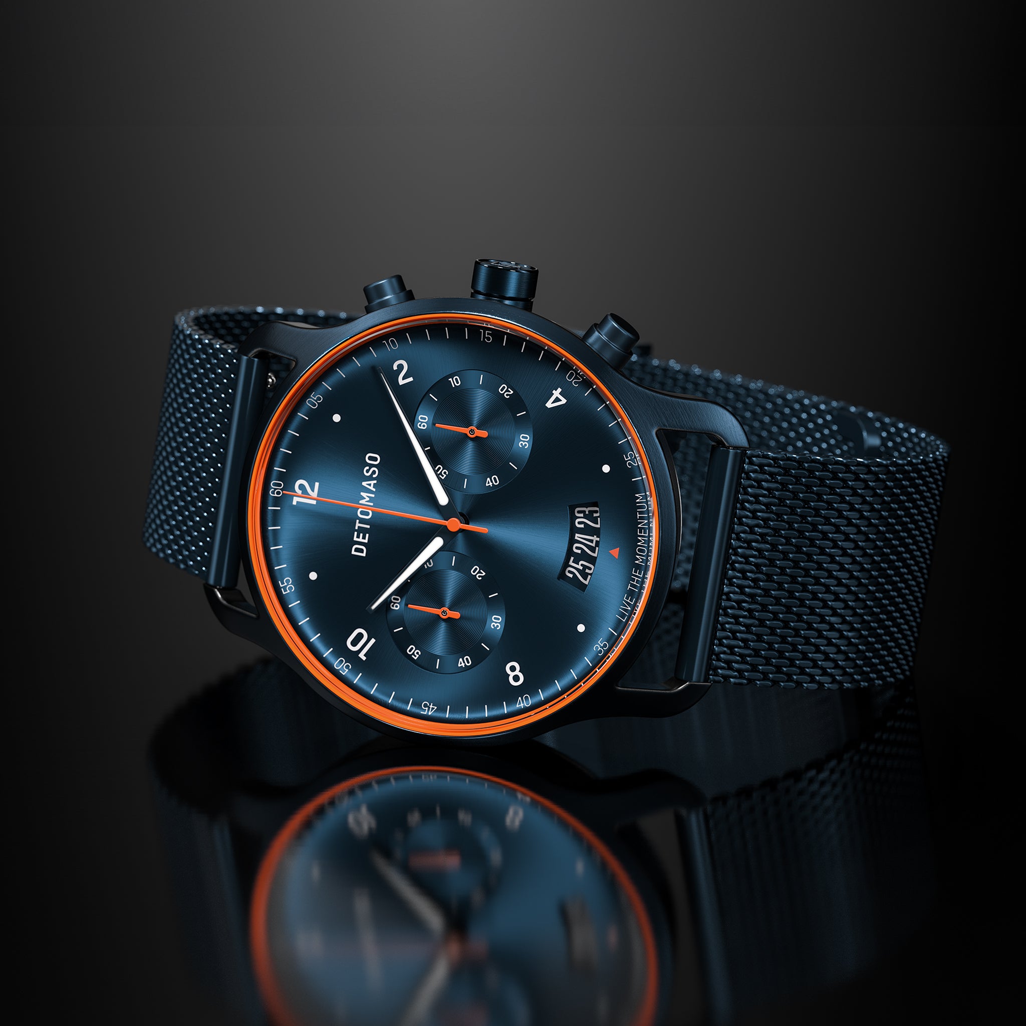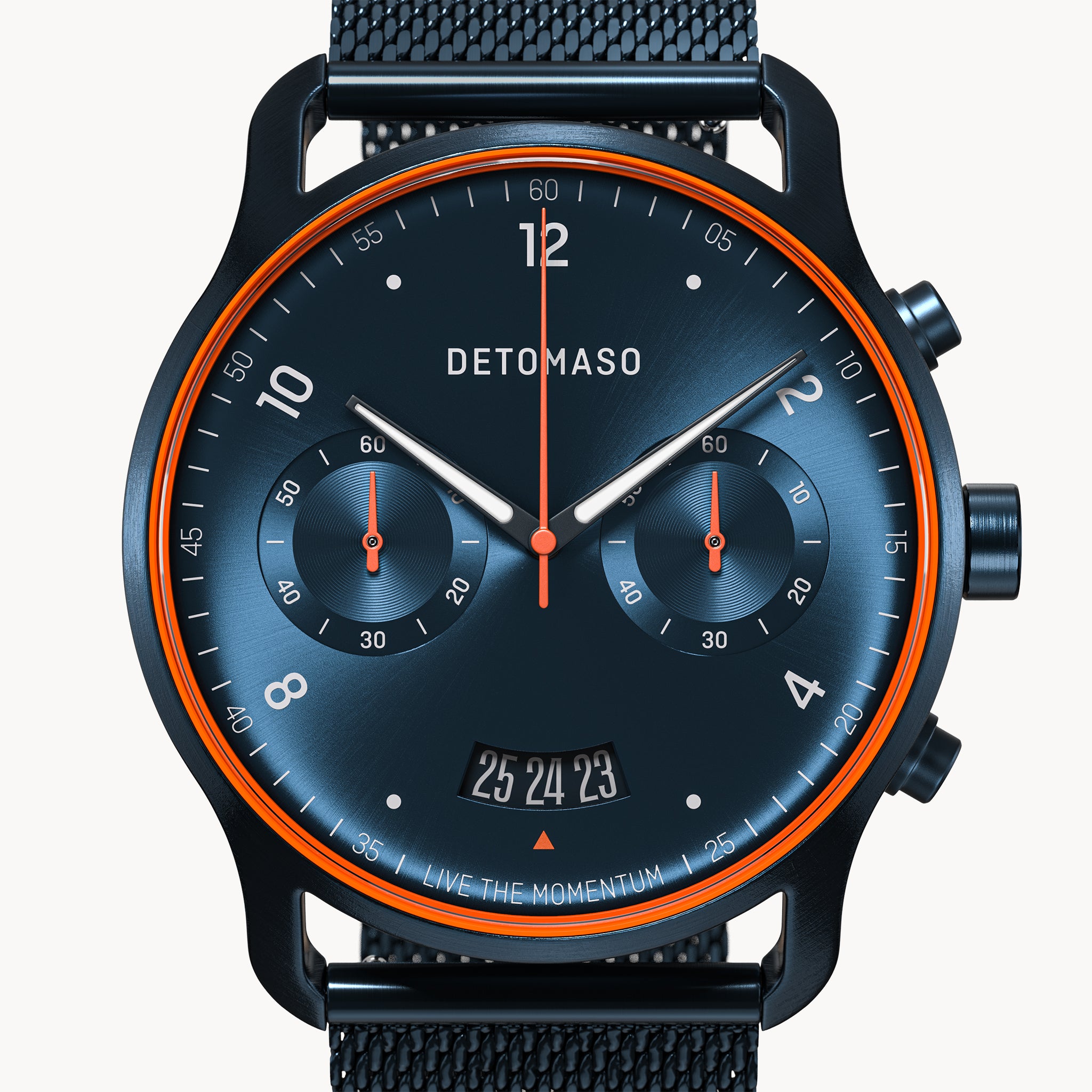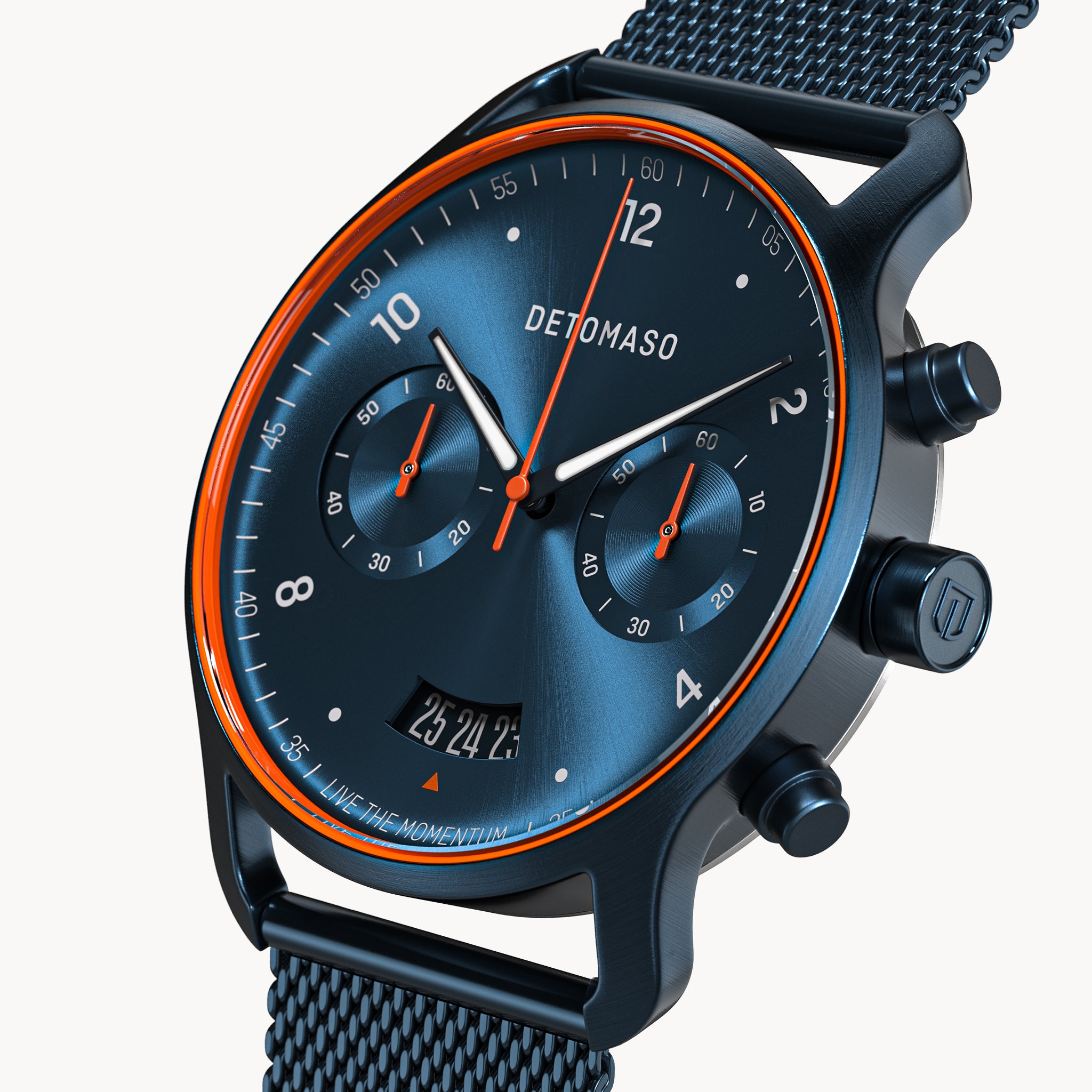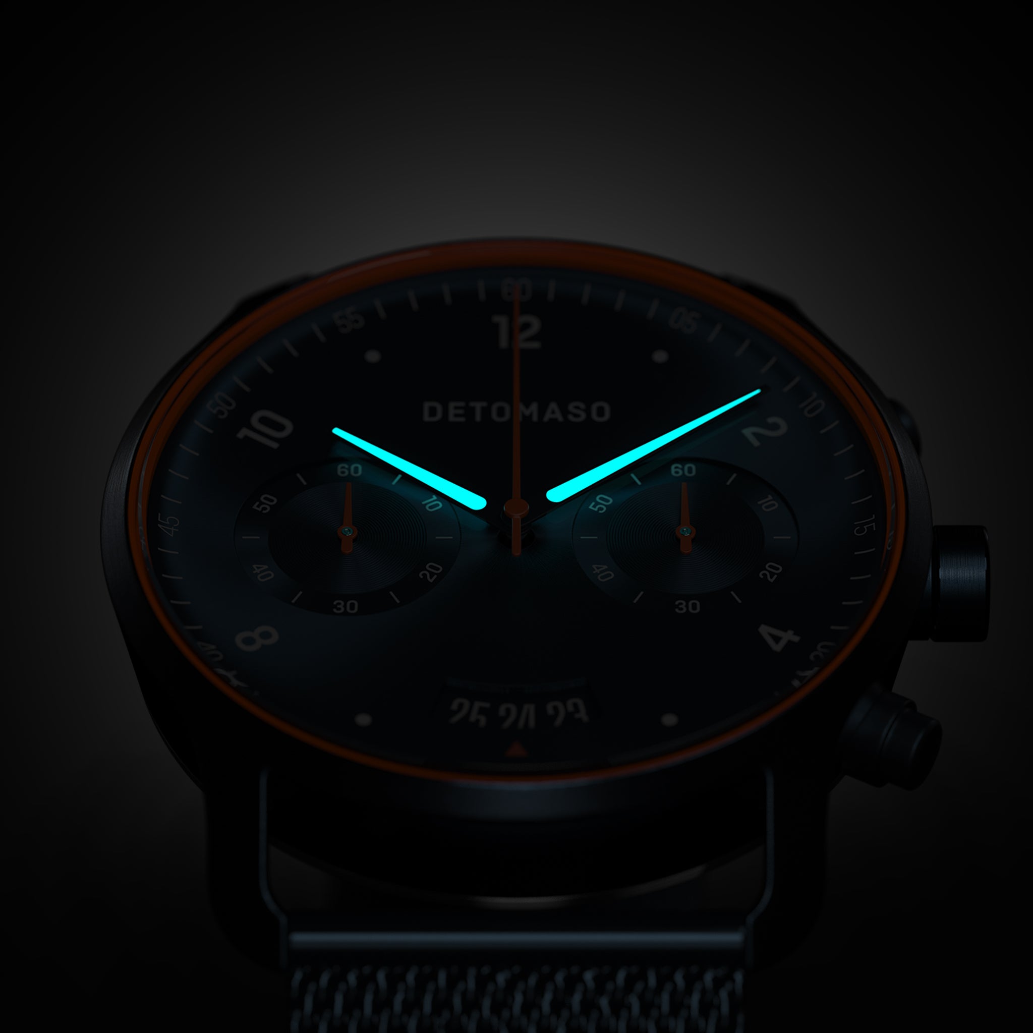 Predkosc znieksztalca otoczenie, a swiatla staja sie dlugimi smugami. Sorpasso po wlosku oznacza wyprzedzanie – a wersja VELOCITÀ zegarka SORPASO CHRONOGRAPH idzie jeszcze o krok dalej. Neonowe akcenty na wskazówkach i indeksach uosabiaja kontrast miedzy czarnym asfaltem a intensywnymi swiatlami. Ten zegarek z tarcza o szlifie slonecznym ma równiez funkcje stopera, która pozwala mierzyc najlepszy czas.