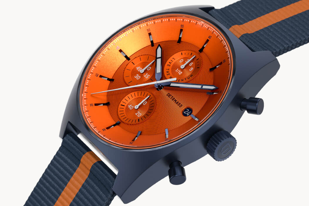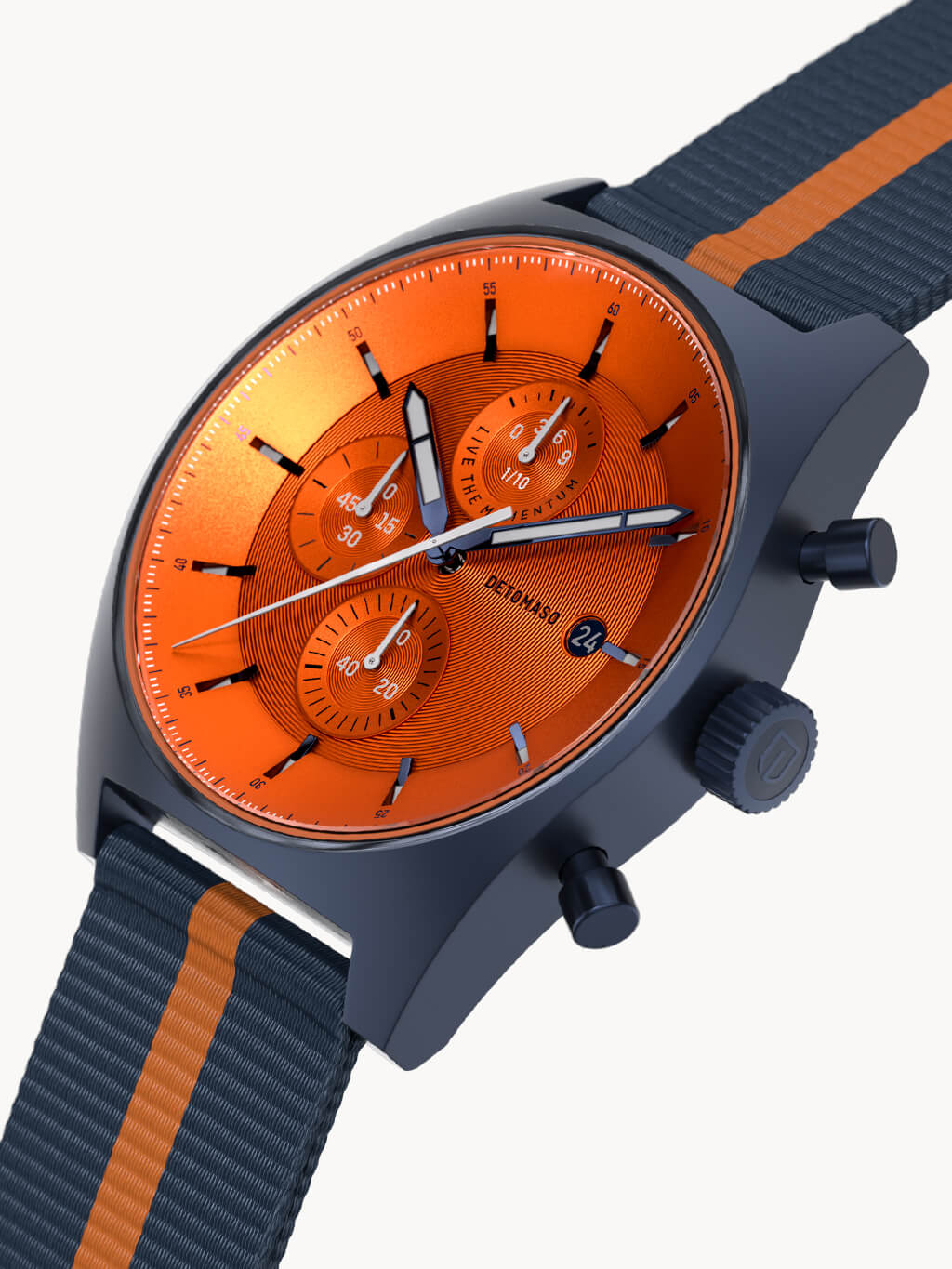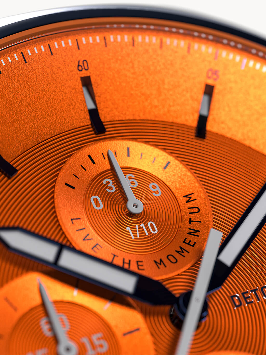 Einfach vom Freiheitsgefühl tragen lassen: Der D10 CHRONOGRAPH versprüht mit seinem dynamischen Design die Aufbruchstimmung kurz vor dem Antritt einer Reise. Wenn später am Ziel die Sonne untergeht, strahlt der Chronograph auch bei Nacht weiter – dank Superluminova auf Stunden- und Minutenzeigern sowie auf den Indizes.