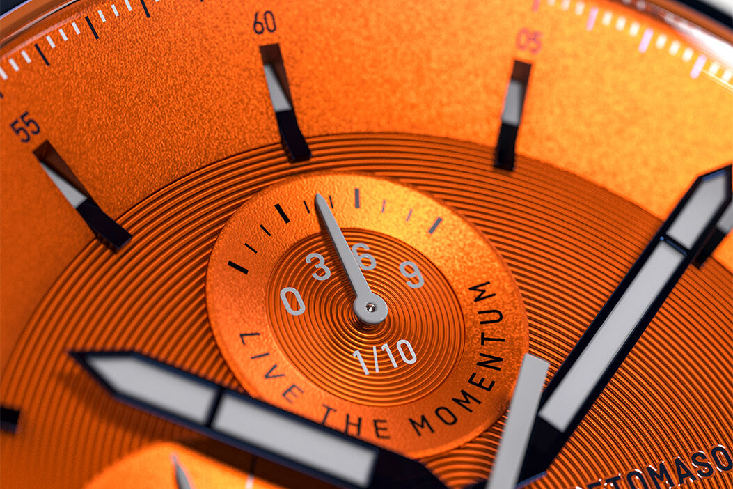 Im oberen Chronographen-Auge lassen sich die 1/10-Stoppsekunden ablesen. Dabei tickt die Zeit ein wenig anders: Die Retrograde-Anzeige bewegt sich von links nach rechts und zurück. Wie die Scheibenwischer eines Autos, wenn auf dem Roadtrip leichter Sommerregen aufkommt.