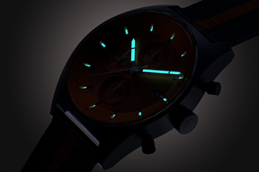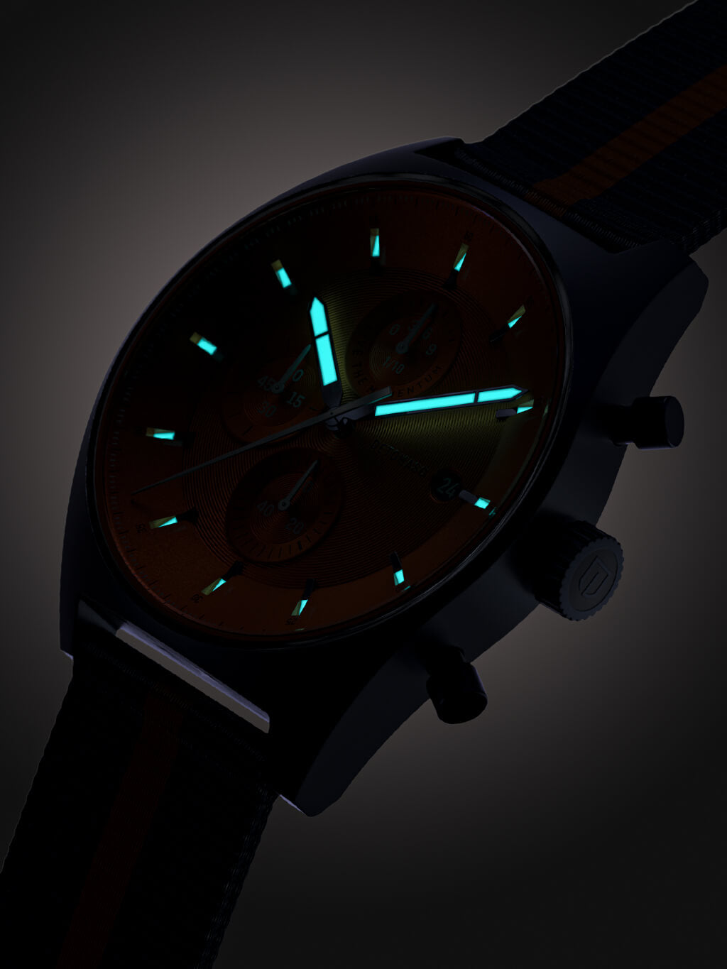 Ein Highlight des D10 CHRONOGRAPH wird erst im Dunkeln wirklich sichtbar. Die Stunden- und Minutenzeiger wurden mit Superluminova beschichtet. Im Dunklen beginnen diese Element zu leuchten – so lässt sich die Uhrzeit auch bei Nacht auf einen Blick erkennen.
