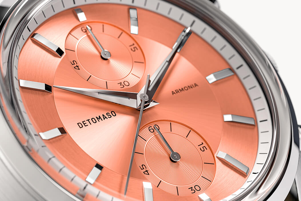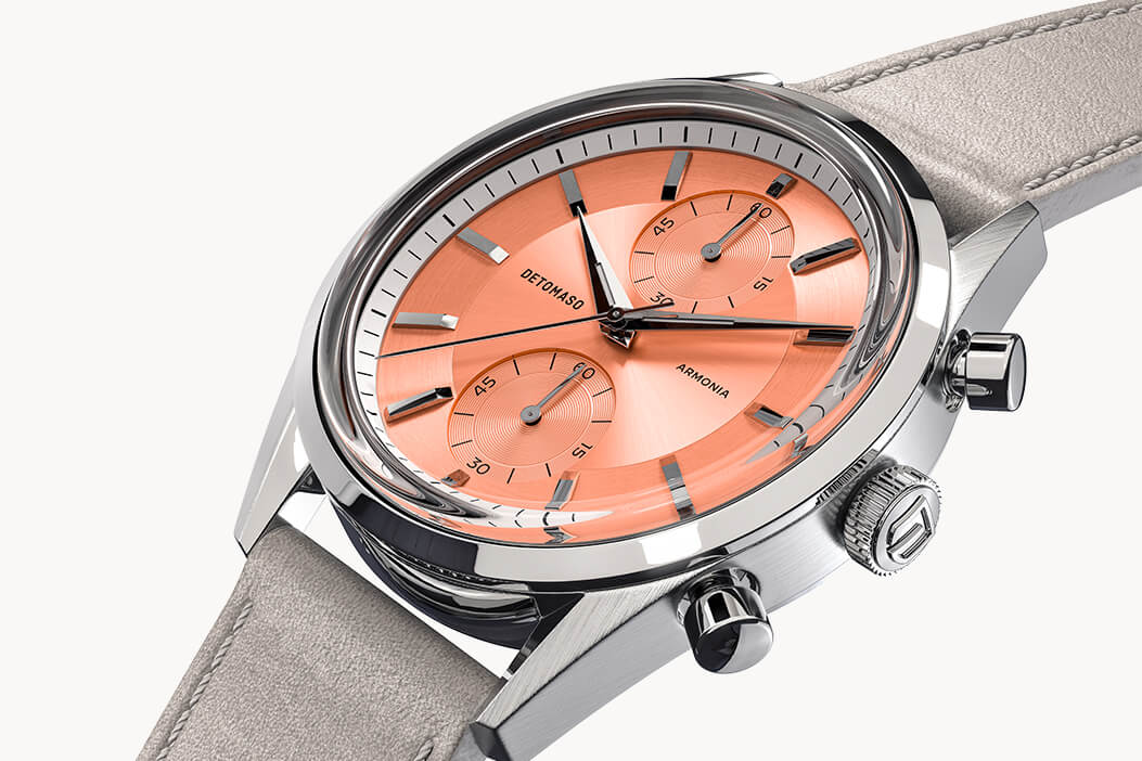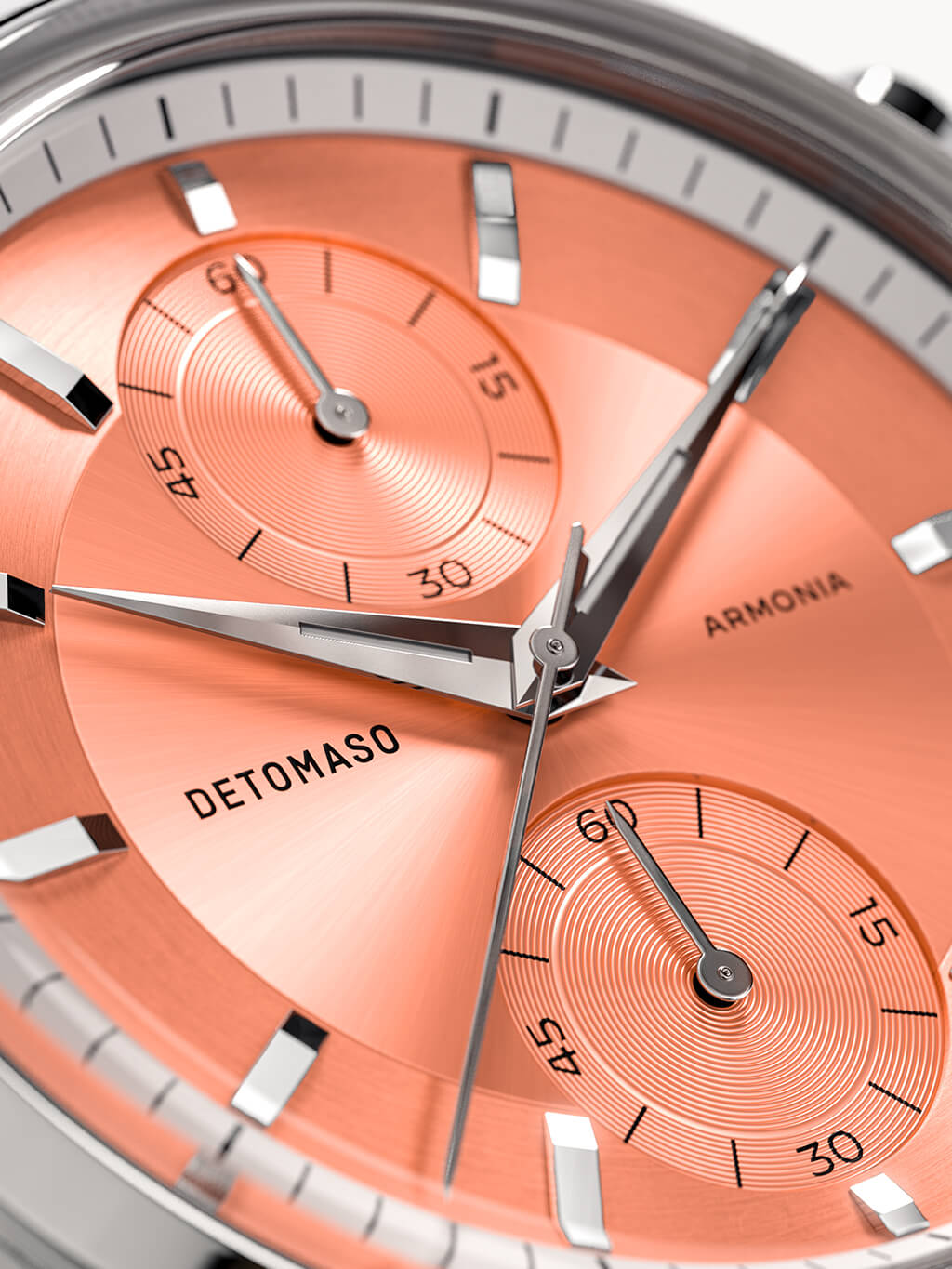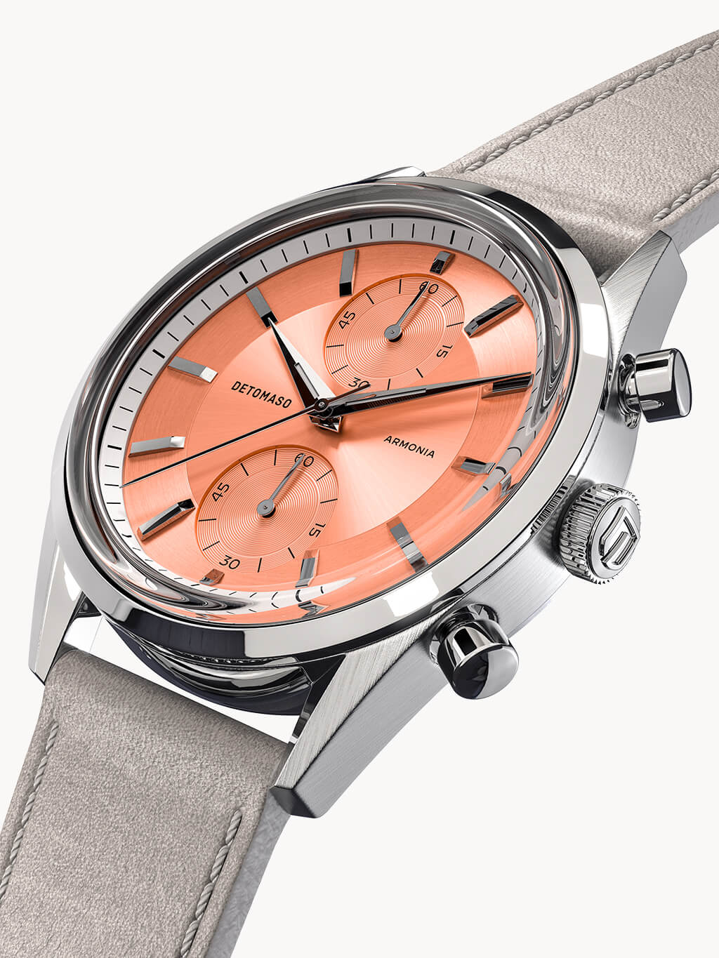 Harmonisches Funkeln: Der ARMONIA CHRONOGRAPH ist dein idealer Begleiter im Alltag und für besondere Anlässe. Mit einem Durchmesser von 39 mm schmückt er jedes Handgelenk. Zeitlos-elegante Formen treffen auf schimmernde Sunray-Schliffe. Diese sorgen für spannende Reflexe auf dem Zifferblatt sowie den Chronographen-Augen. Die große Farbauswahl reicht von kräftigem Türkis über starkes Braun bis hin zu trendy Rosa – welche Facette möchtest du heute zeigen?
