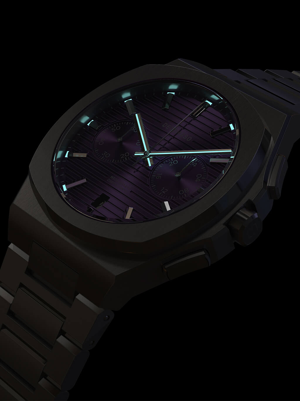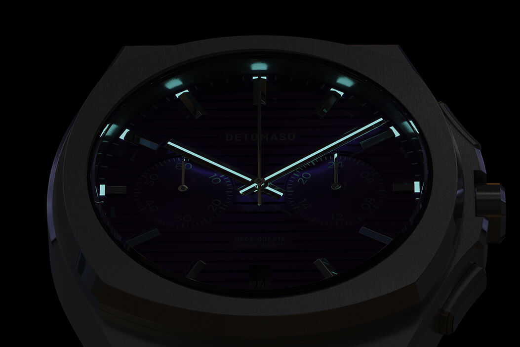 Die fein geprägten Linien und verschiedenen Ebenen des Zifferblatts sorgen für einen faszinieren 3D-Effekt. Aber auch im Dunkeln lässt die Faszination nicht nach: Die Stunden- und Minutenzeiger sind durchgehend mit besonders hellem Superluminova durchzogen, ebenso die Indizes. Das fluoreszierende Material lädt sich im Licht auf und leuchtet dann im Dunkeln besonders magisch.