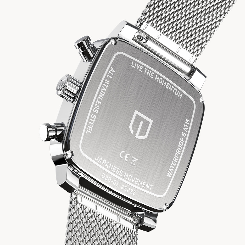 Jede Zehntelsekunde kann entscheidend sein. Darum setzen wir beim D20 CHRONO STRADALE auf das ebenso zuverlässige wie präzise Quarzwerk VD56 von TMI. Mit den beiden Drückern an der Gehäuseseite lässt sich die Zeit stoppen. Der erste Drücker setzt die Chronographen-Anzeige in Bewegung, der zweite stoppt sie wieder. So leicht hast du alles unter Kontrolle.
