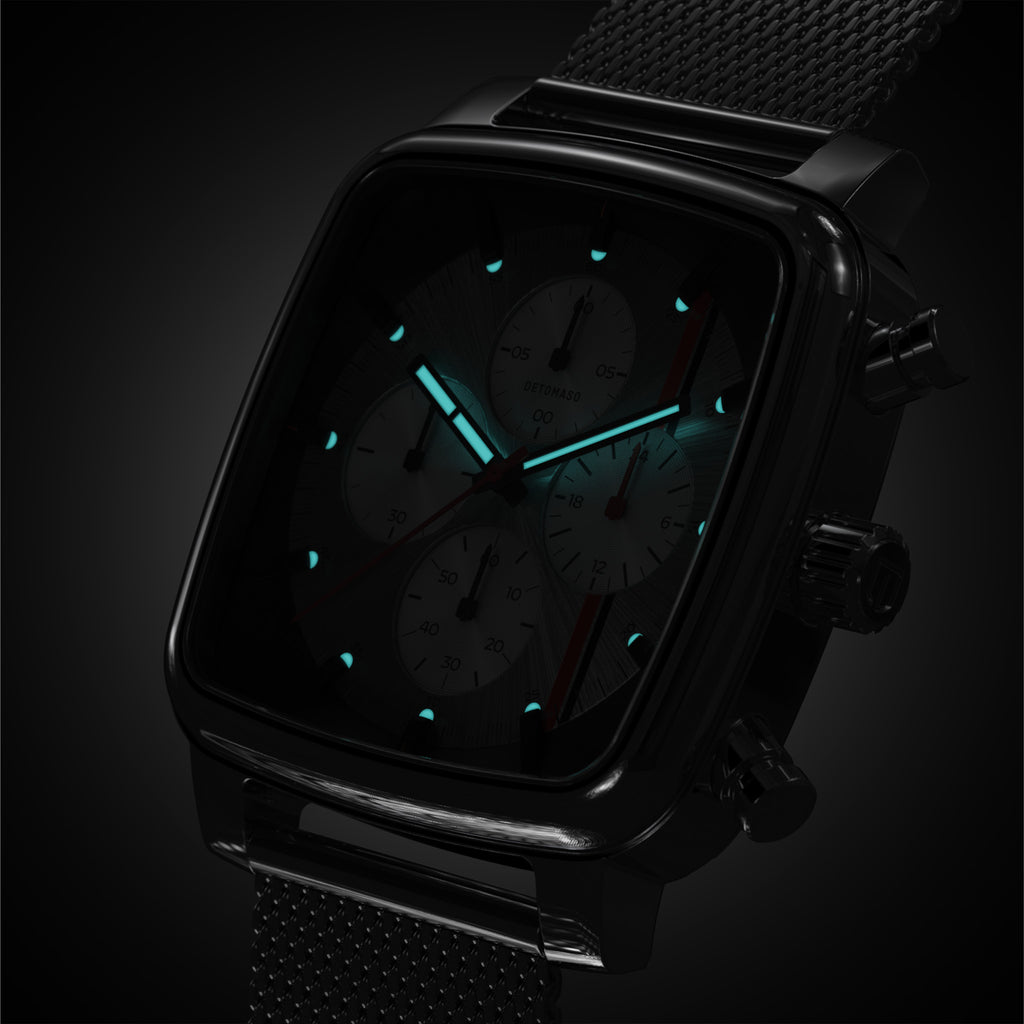 Das viereckige, abgerundete Gehäuse, das Zifferblatt mit den vier zusätzlichen Anzeigen, Superluminova-Elementen und sogar Details wie die Zeigerform sind durchzogen von Vintage-Racing-Charme.